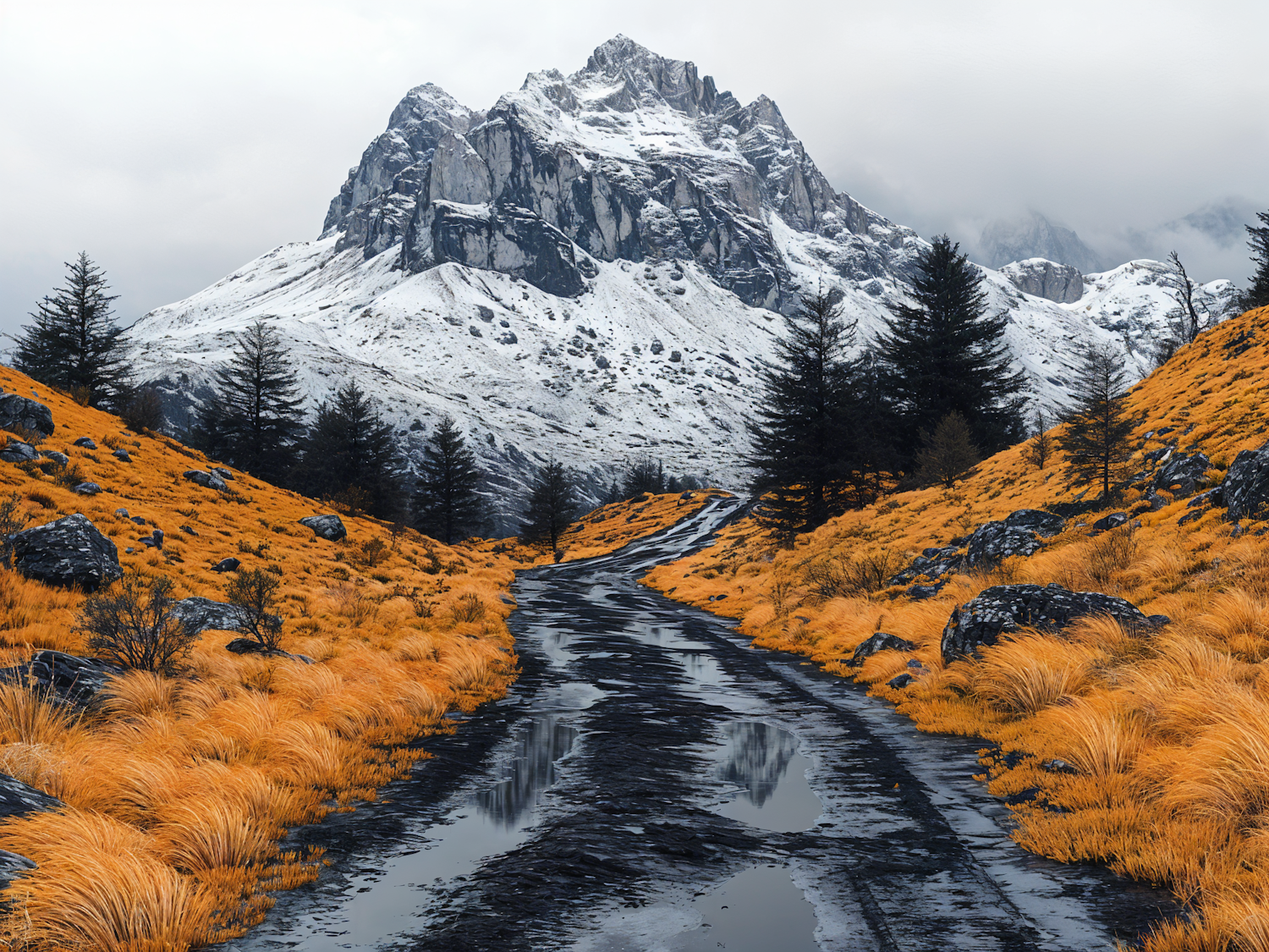 Vibrant orange grass contrasts with a snowy mountain backdrop, creating a striking landscape with a winding path and misty peaks.