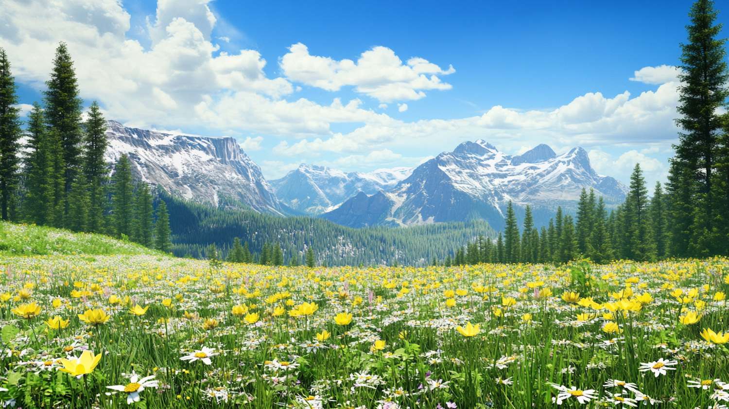 A vibrant meadow with wildflowers, pine trees, and snow-capped mountains under a blue sky with clouds.