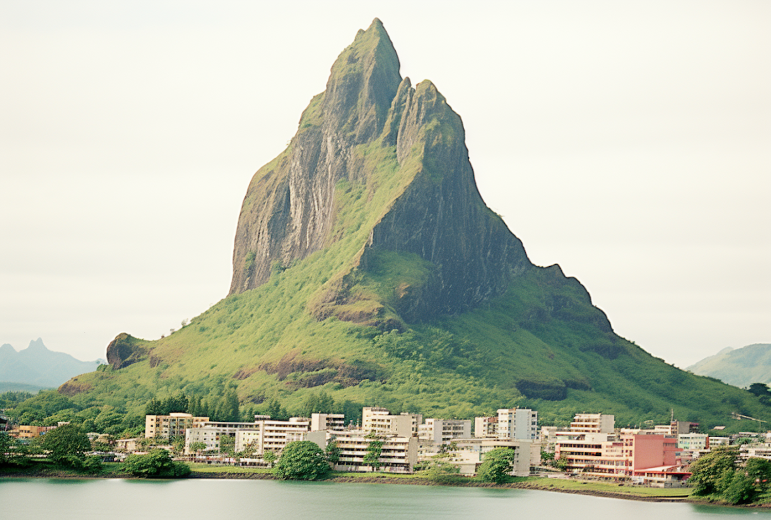 Majestic mountain with lush greenery towers over a serene town by the water, under an overcast sky.