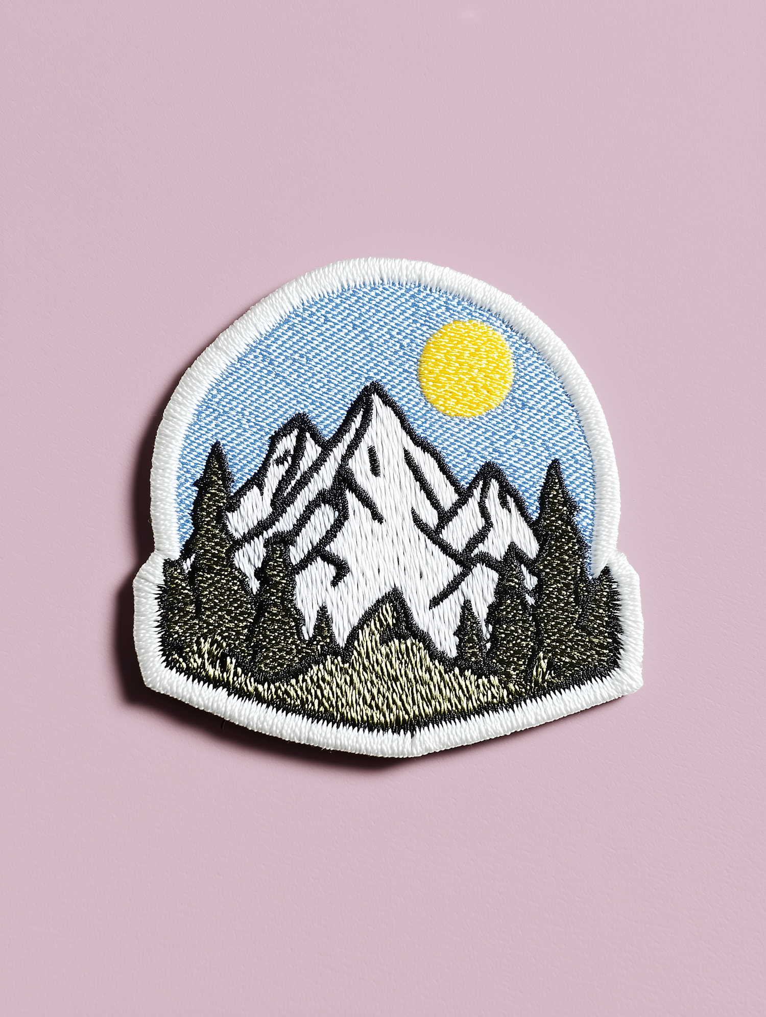 A colorful embroidered patch with a mountain scene, featuring snow-capped peaks, pine trees, and a sun, set against a pastel pink background.