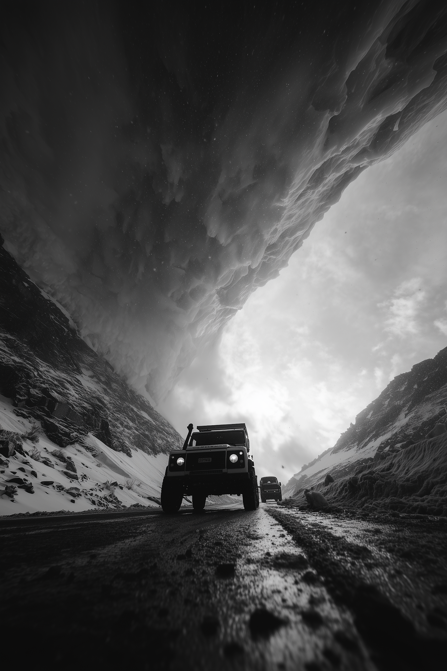 Two off-road vehicles traverse a snowy mountain road under a dramatic, cloud-filled sky in this striking black-and-white image.