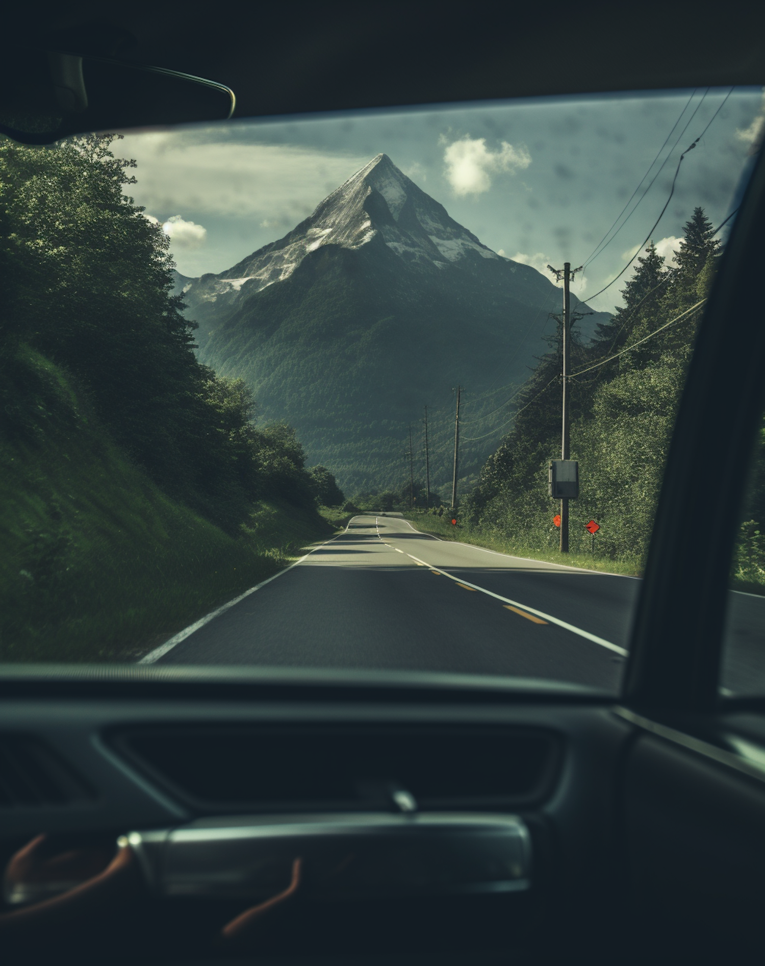 View from a car of a winding road leading to a snow-capped mountain under a cloudy sky, framed by lush greenery.