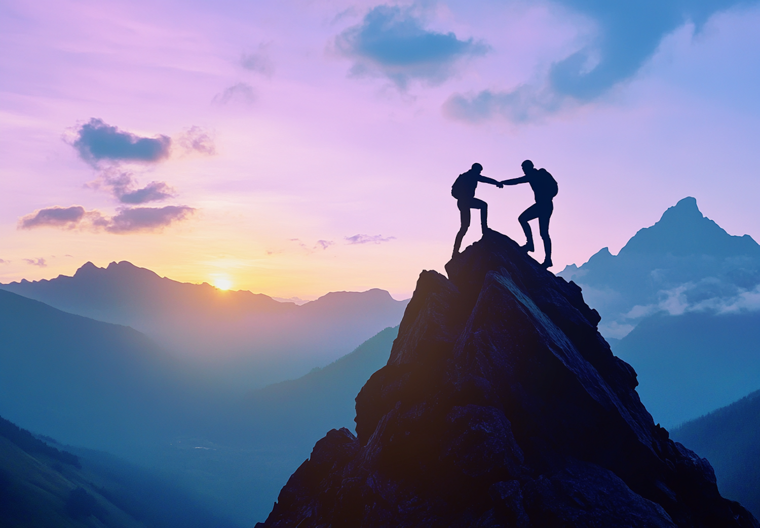 Silhouetted hikers on a mountain peak at sunset, showcasing teamwork and adventure against a vibrant sky.