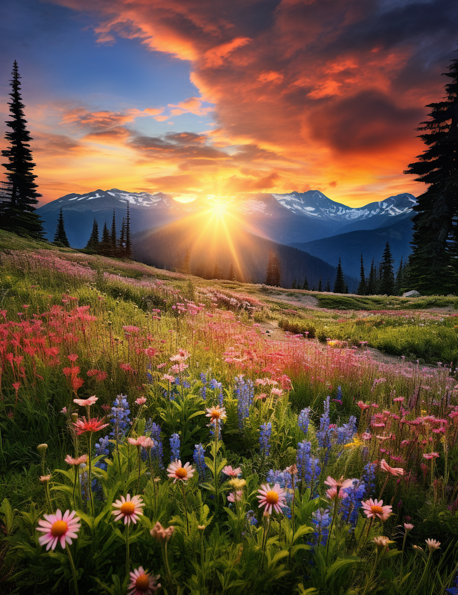 Vibrant sunset over a wildflower meadow with snow-capped mountains and evergreen trees, creating a serene and majestic landscape.
