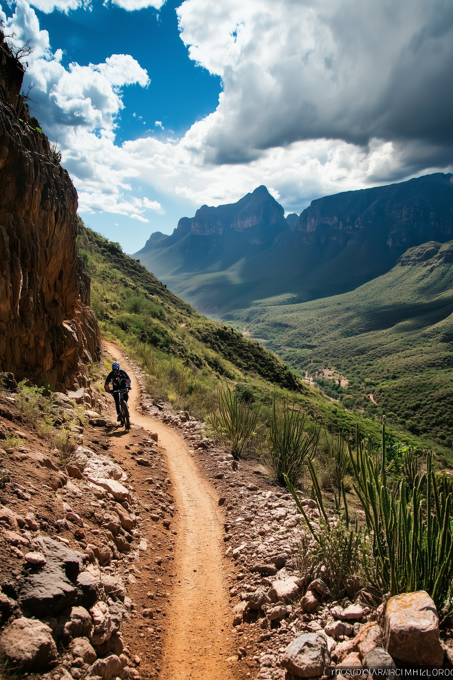 Cyclist on a rugged mountain trail with dramatic clouds and lush green valleys in the background.