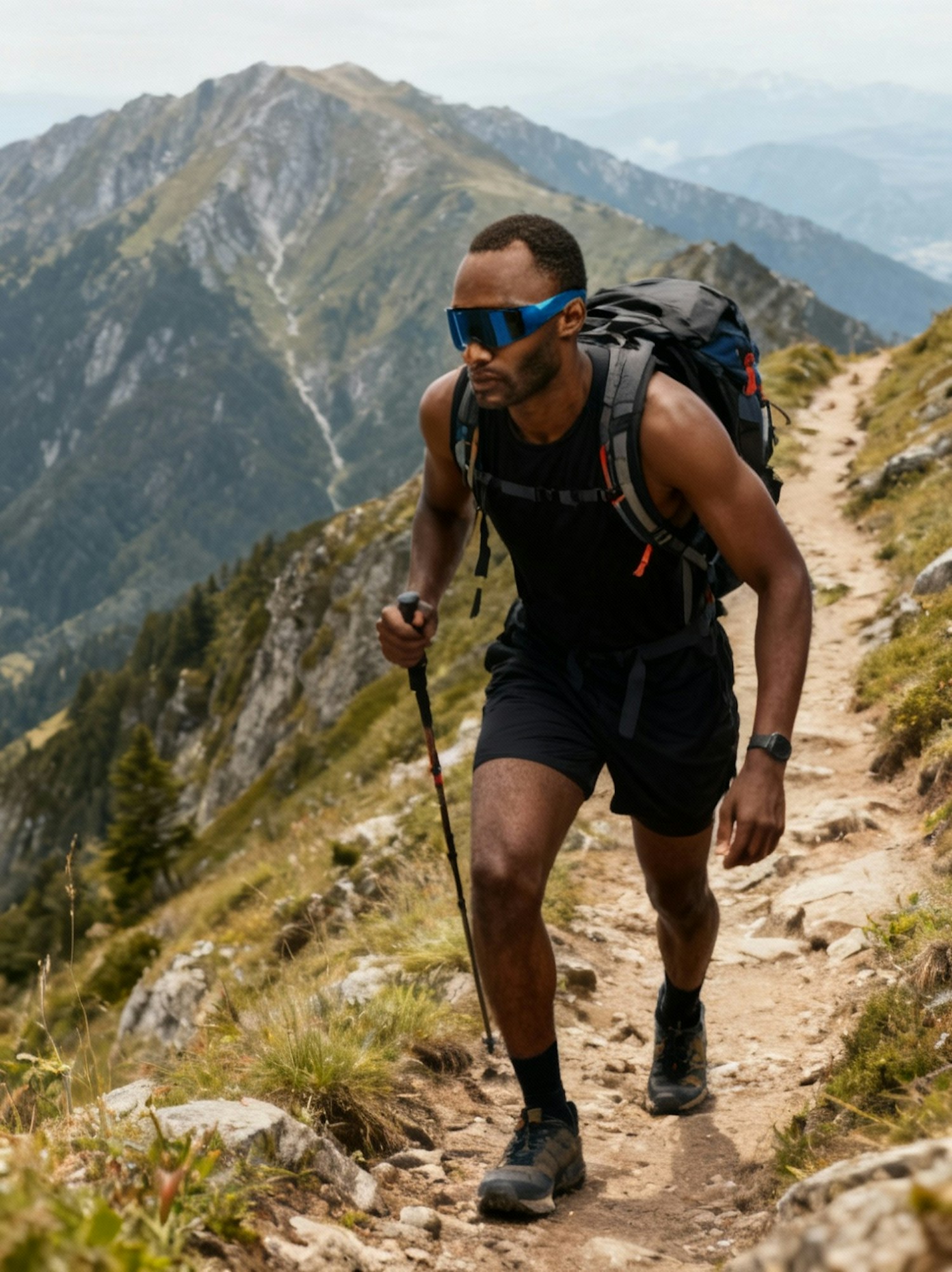 A hiker on a mountain trail with a backpack and trekking poles, surrounded by scenic peaks and greenery under a partly cloudy sky.