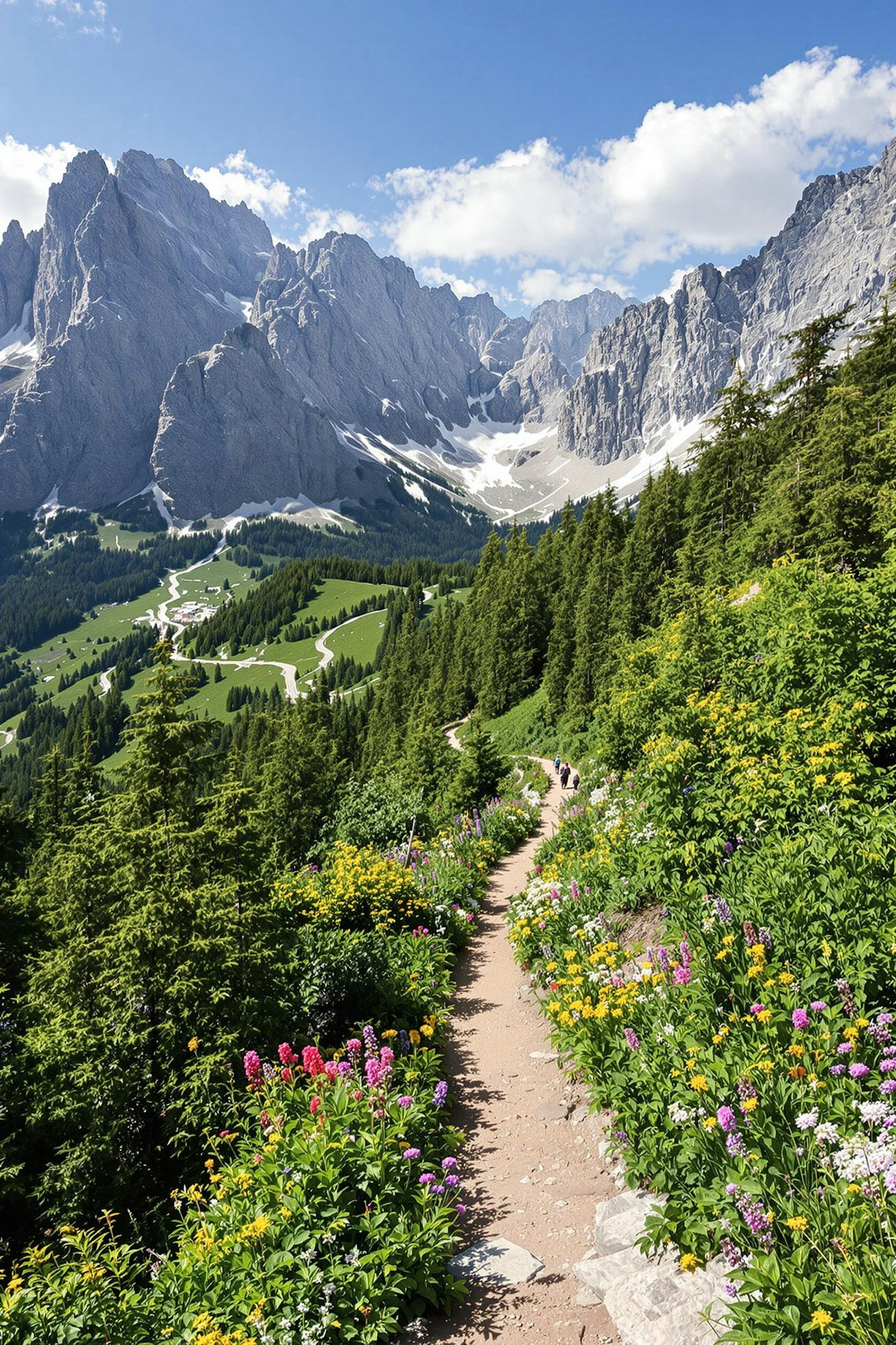 A scenic mountain trail surrounded by colorful wildflowers, lush greenery, and towering peaks under a bright blue sky.