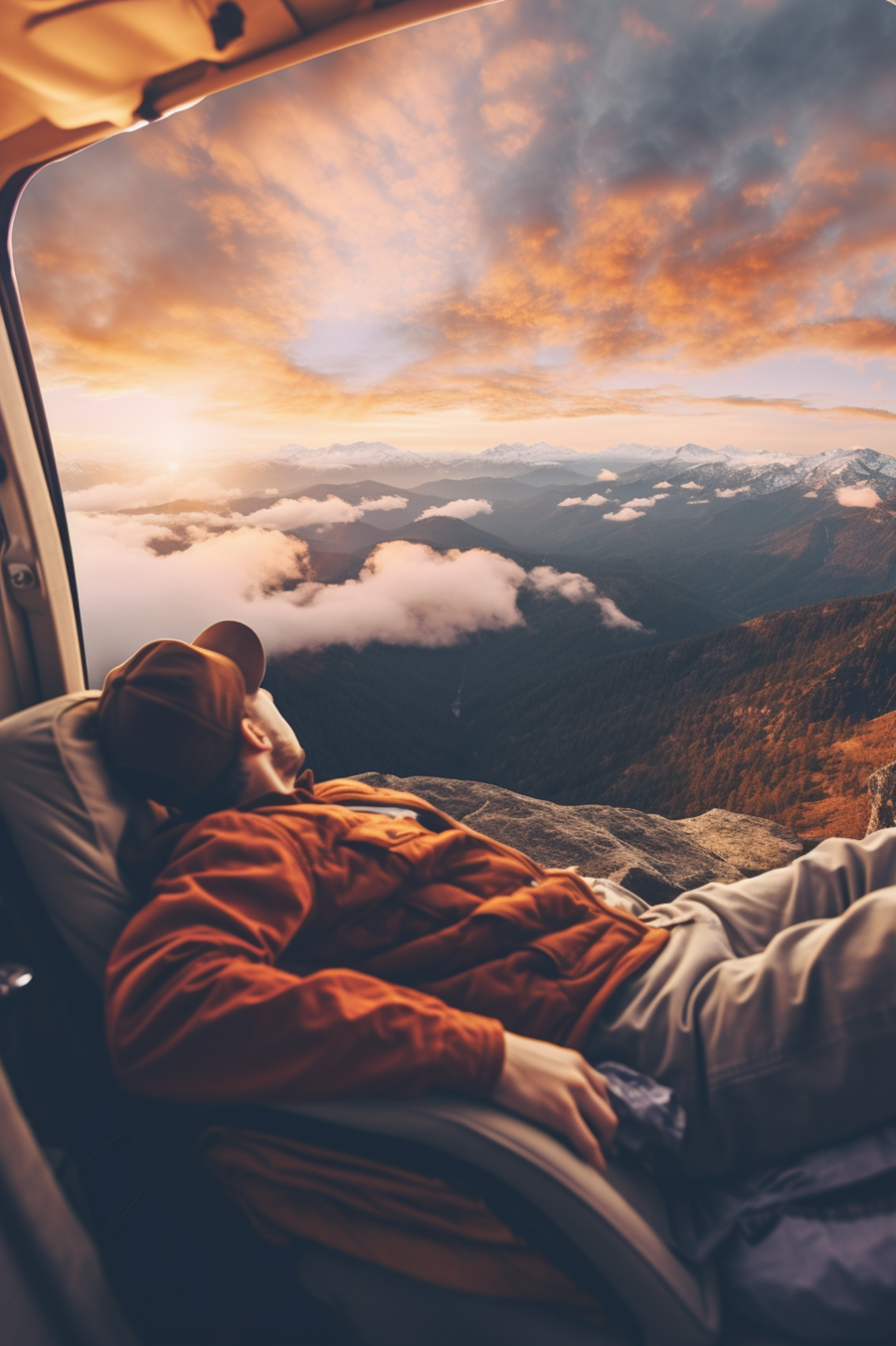 Man in orange jacket relaxes in vehicle, enjoying stunning mountain sunset view with vibrant sky and snow-capped peaks.