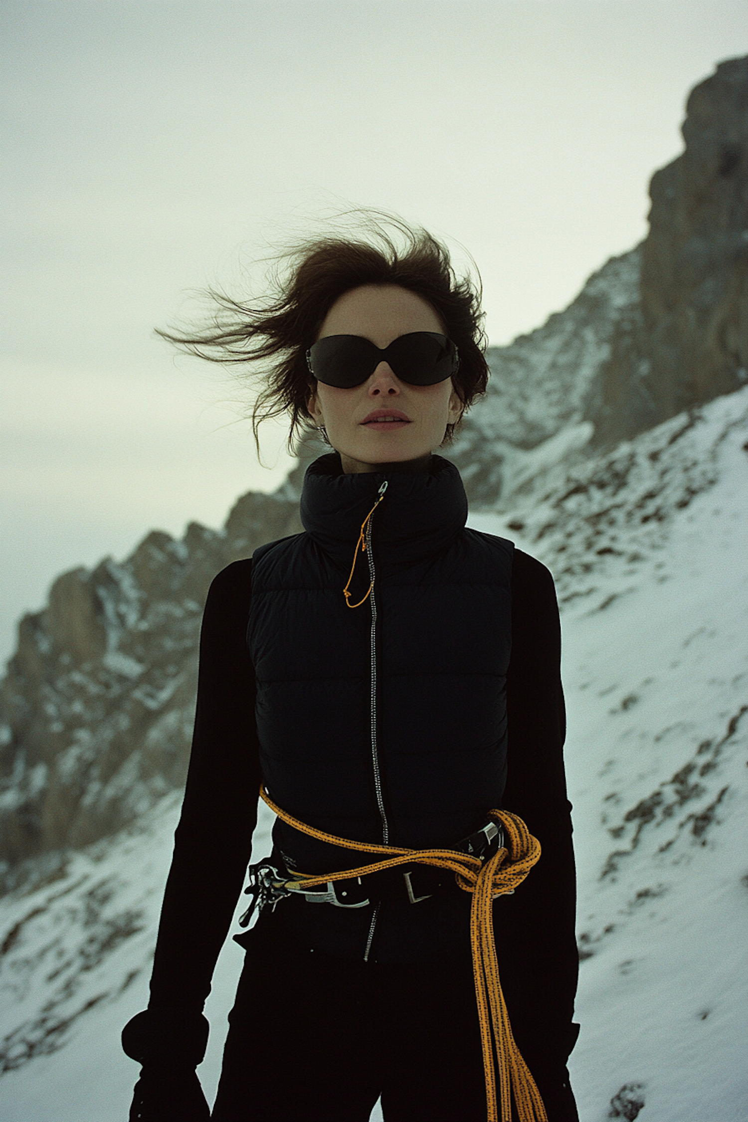 Woman in black puffer vest with climbing rope in snowy mountains, wearing sunglasses. Rugged peaks and cloudy sky in background.