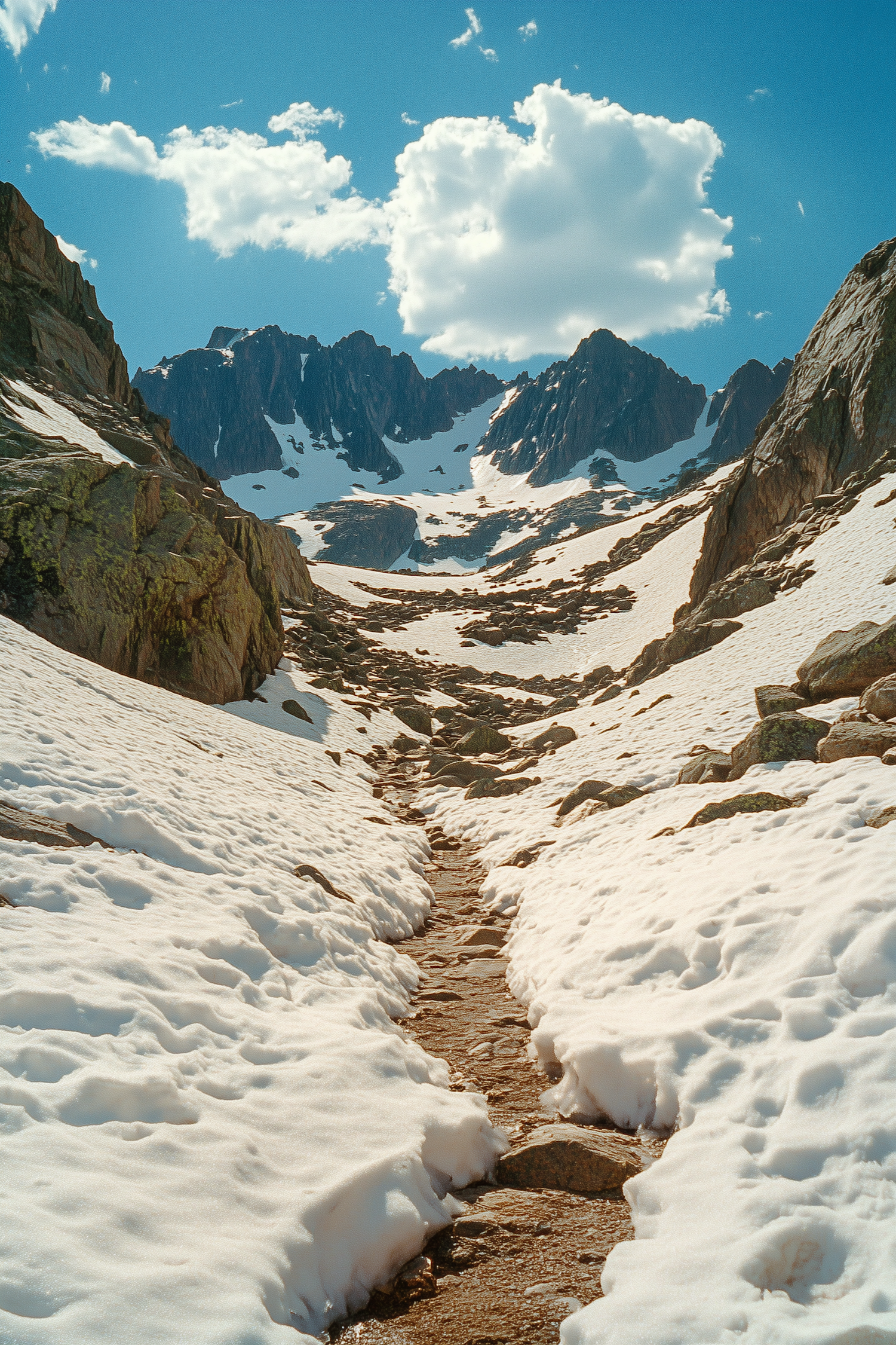 Snow-covered mountain pass with a rocky path leading to jagged peaks under a vibrant blue sky with fluffy clouds.