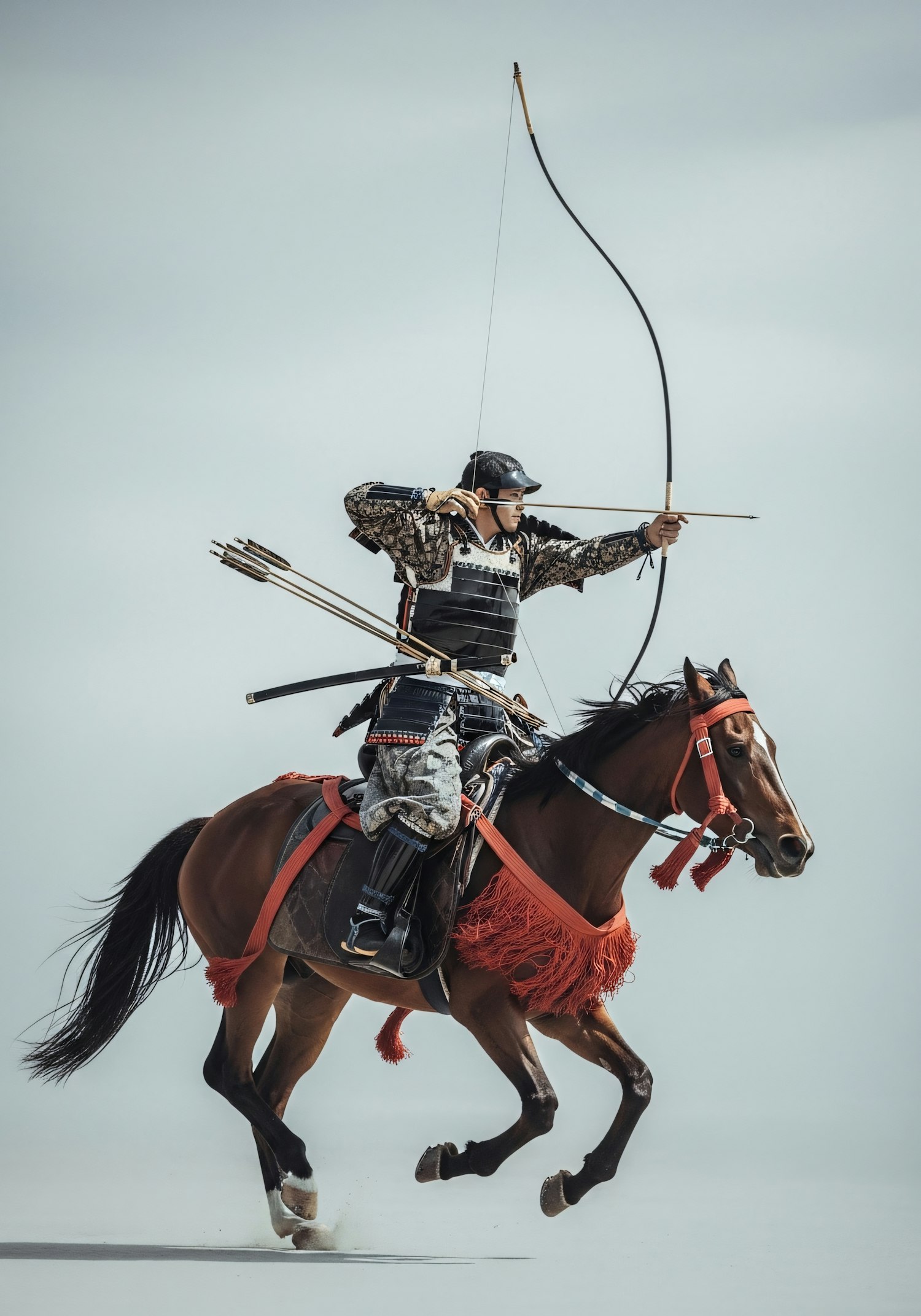 A mounted archer in traditional attire draws a bow while riding a galloping horse, showcasing skill and precision in a dynamic scene.