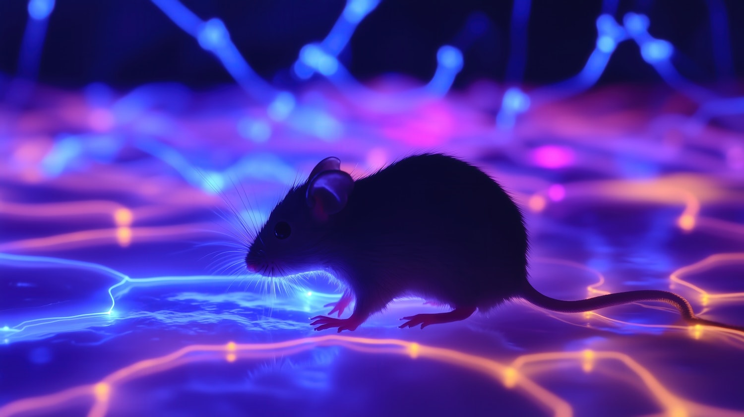 A silhouetted mouse on a glowing neural-like background with vibrant blue, purple, and pink hues, blending nature and futuristic design.