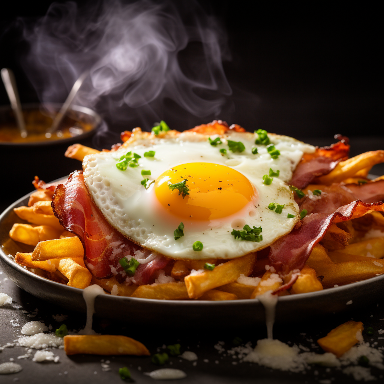 Delicious sunny-side-up egg on crispy fries with bacon and herbs, steaming hot and ready to enjoy. Perfect comfort food.