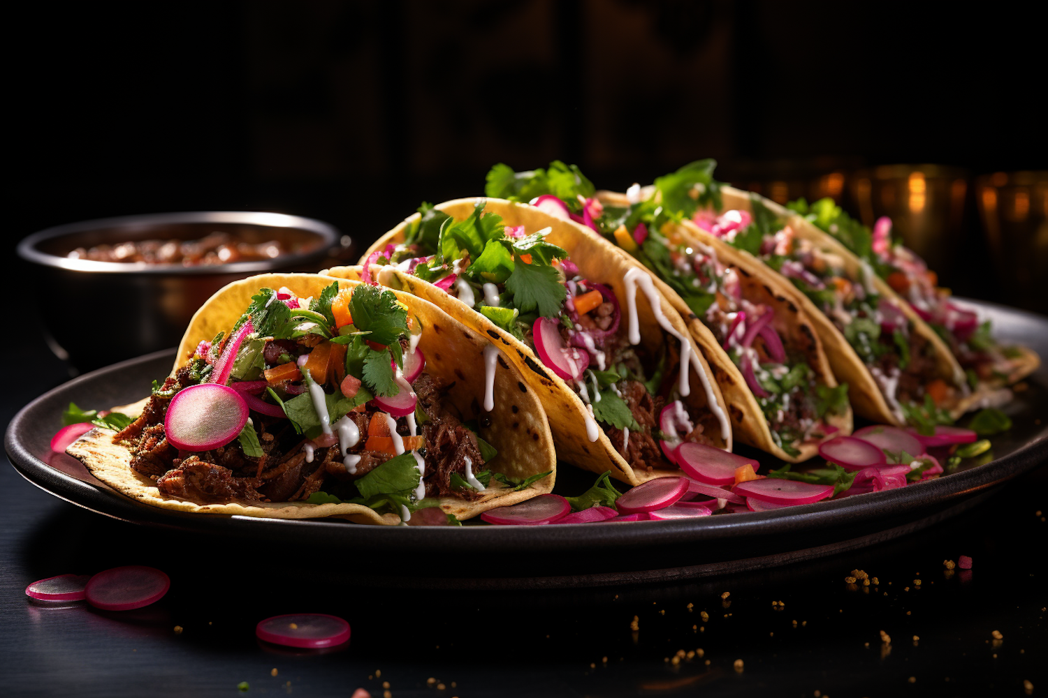 Delicious tacos with shredded meat, cilantro, radishes, and creamy sauce on a dark platter, perfect for a flavorful meal.