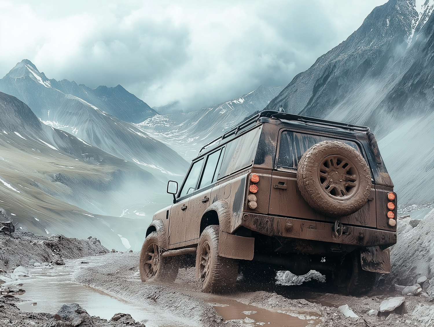 Mud-covered SUV tackles a rugged mountain trail, surrounded by dramatic snow-capped peaks and cloudy skies.