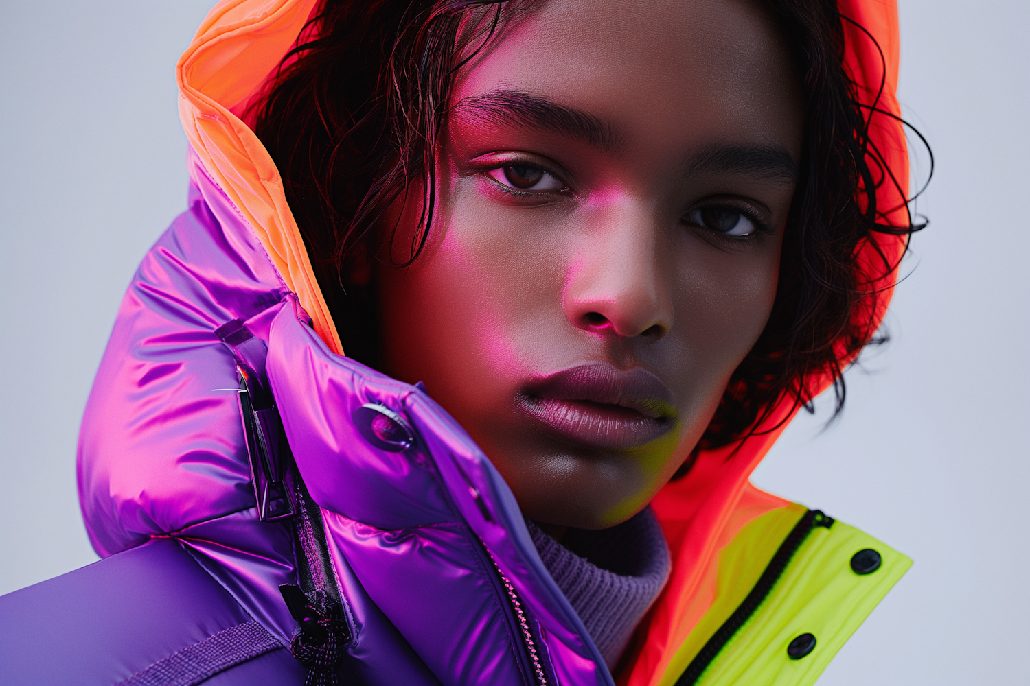 Close-up of a person in a vibrant purple puffer jacket with an orange hood, highlighted by pink lighting.