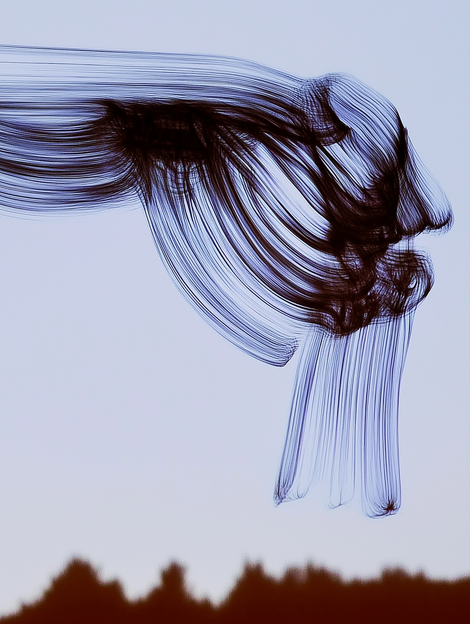 A stunning murmuration of birds forming intricate, flowing patterns in the sky, resembling a hand or wing-like structure.