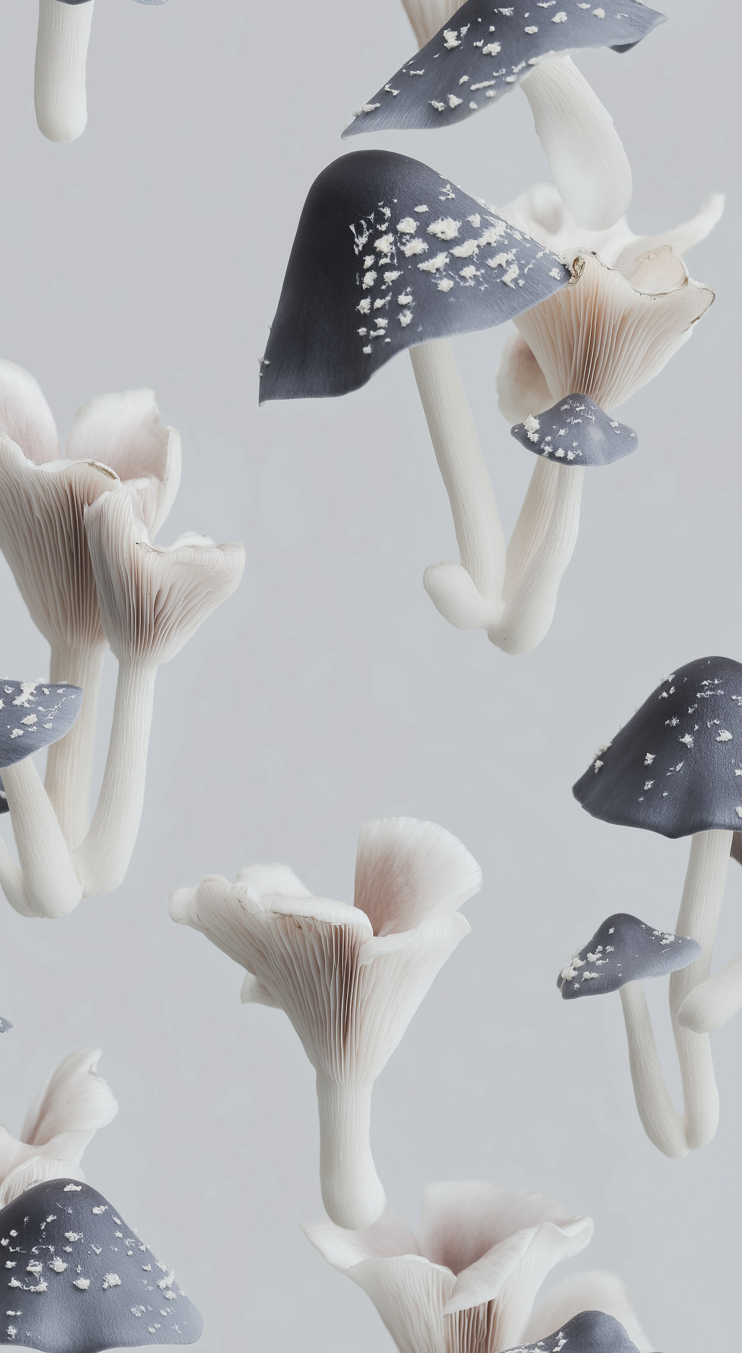 Elegant mushrooms with white stems and gray caps, having a delicate, artistic appearance, photographed against a light gray background.
