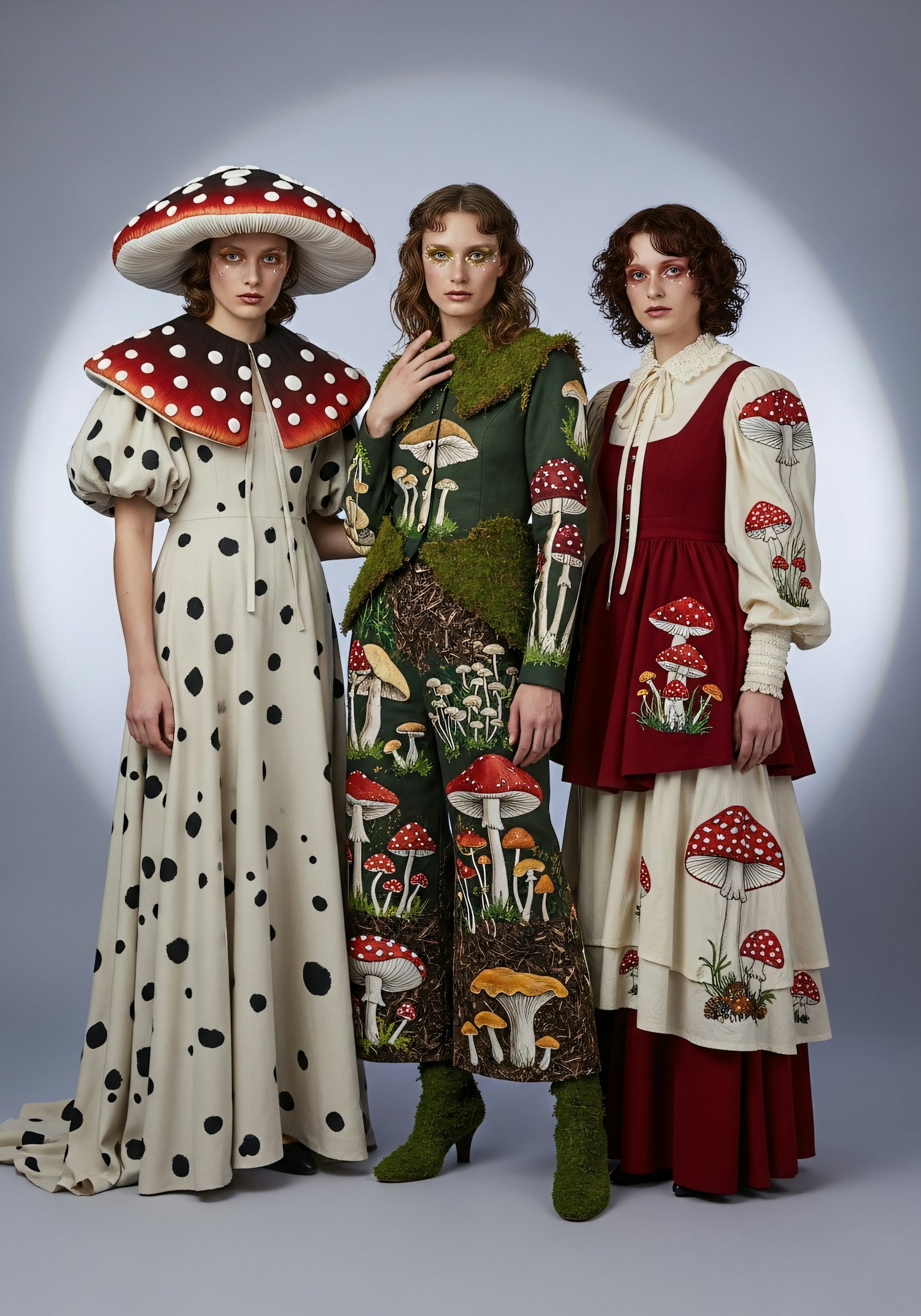 Three models showcase mushroom-themed fashion with intricate designs and earthy textures, set against a neutral backdrop.