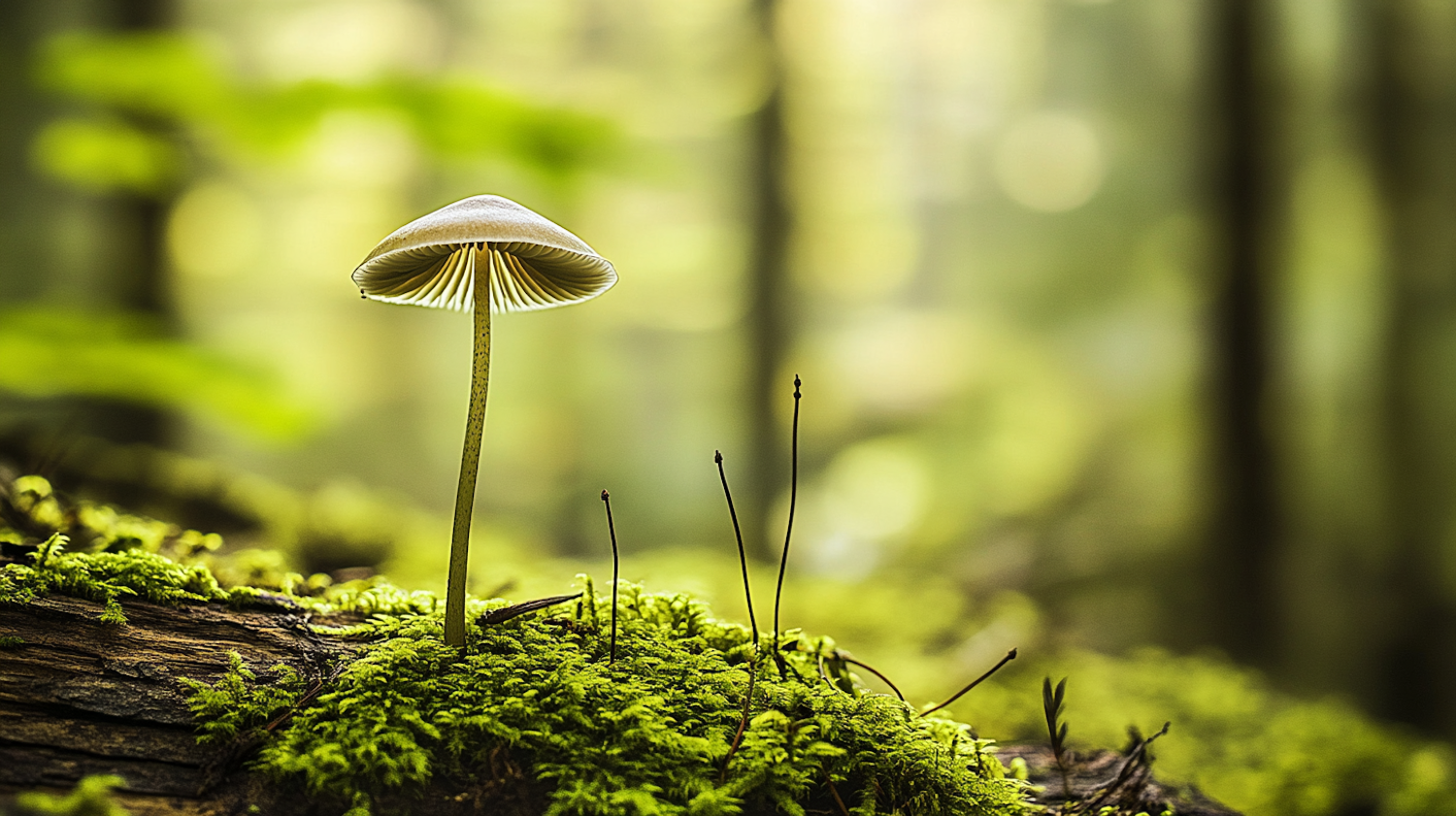 A delicate mushroom on vibrant moss in a lush forest, showcasing nature's intricate beauty and tranquility.