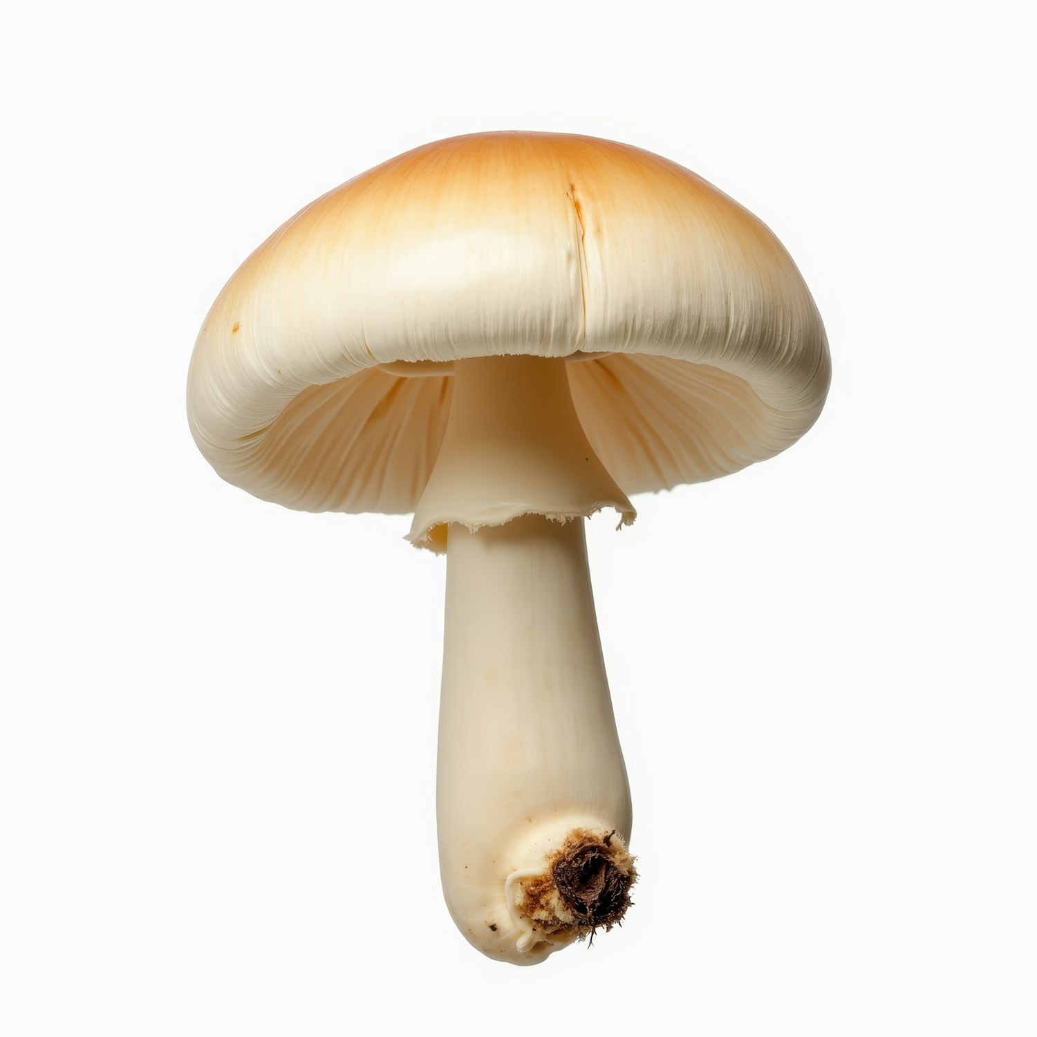Close-up of a fresh mushroom with a creamy cap and visible gills against a white background.