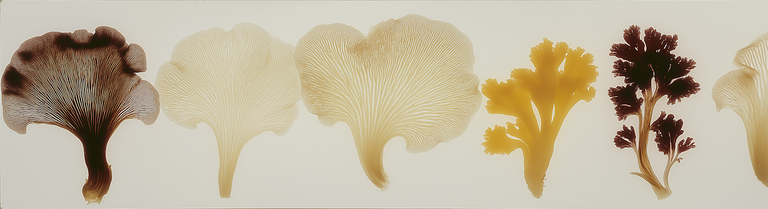 A collection of mushroom spore prints in various colors and patterns, beautifully arranged on a light background.