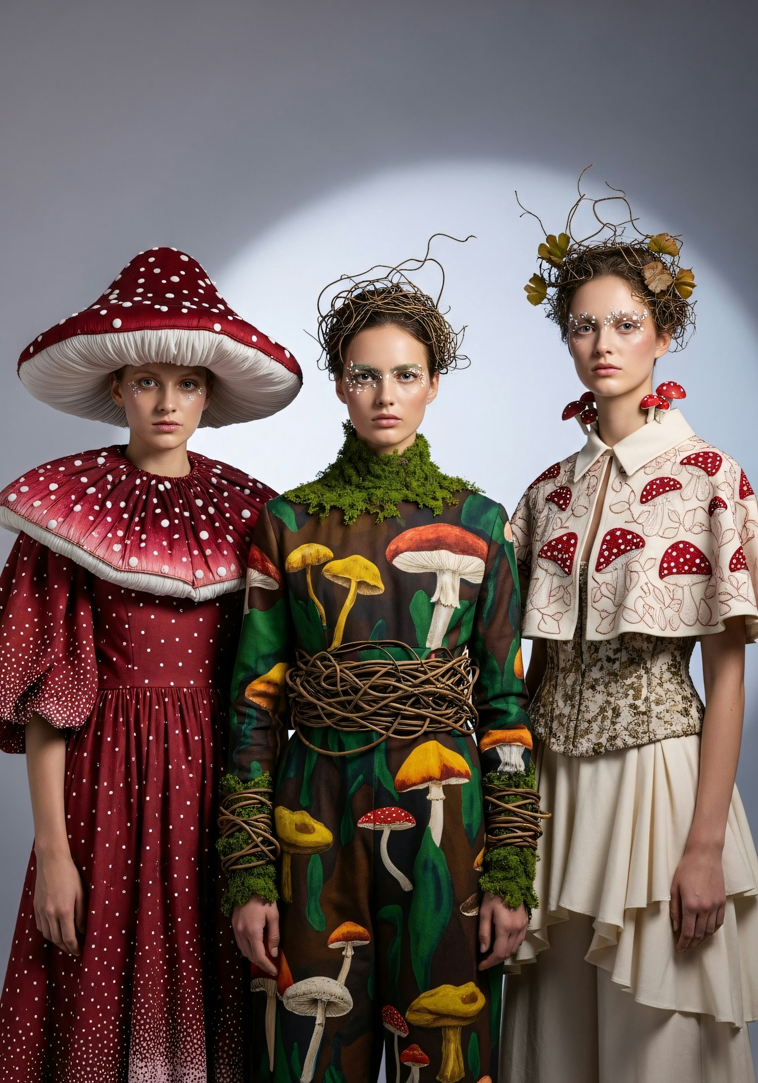 Three individuals in artistic, mushroom-themed costumes with intricate details and nature-inspired designs, set against a neutral background.