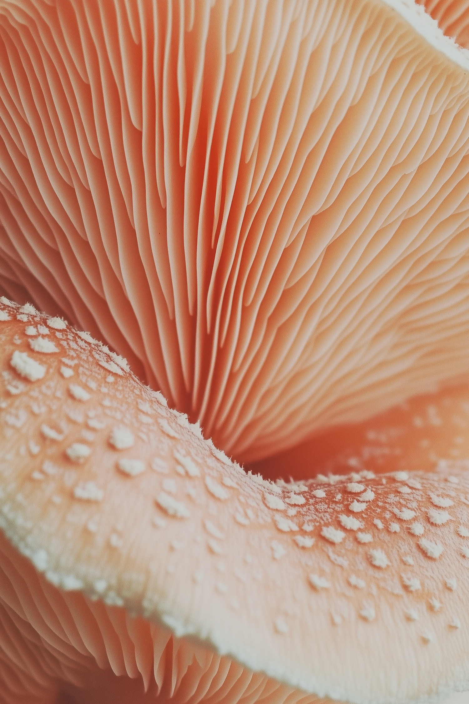 Close-up of a mushroom's gills with peach hues and textured white spots, highlighting intricate natural details.