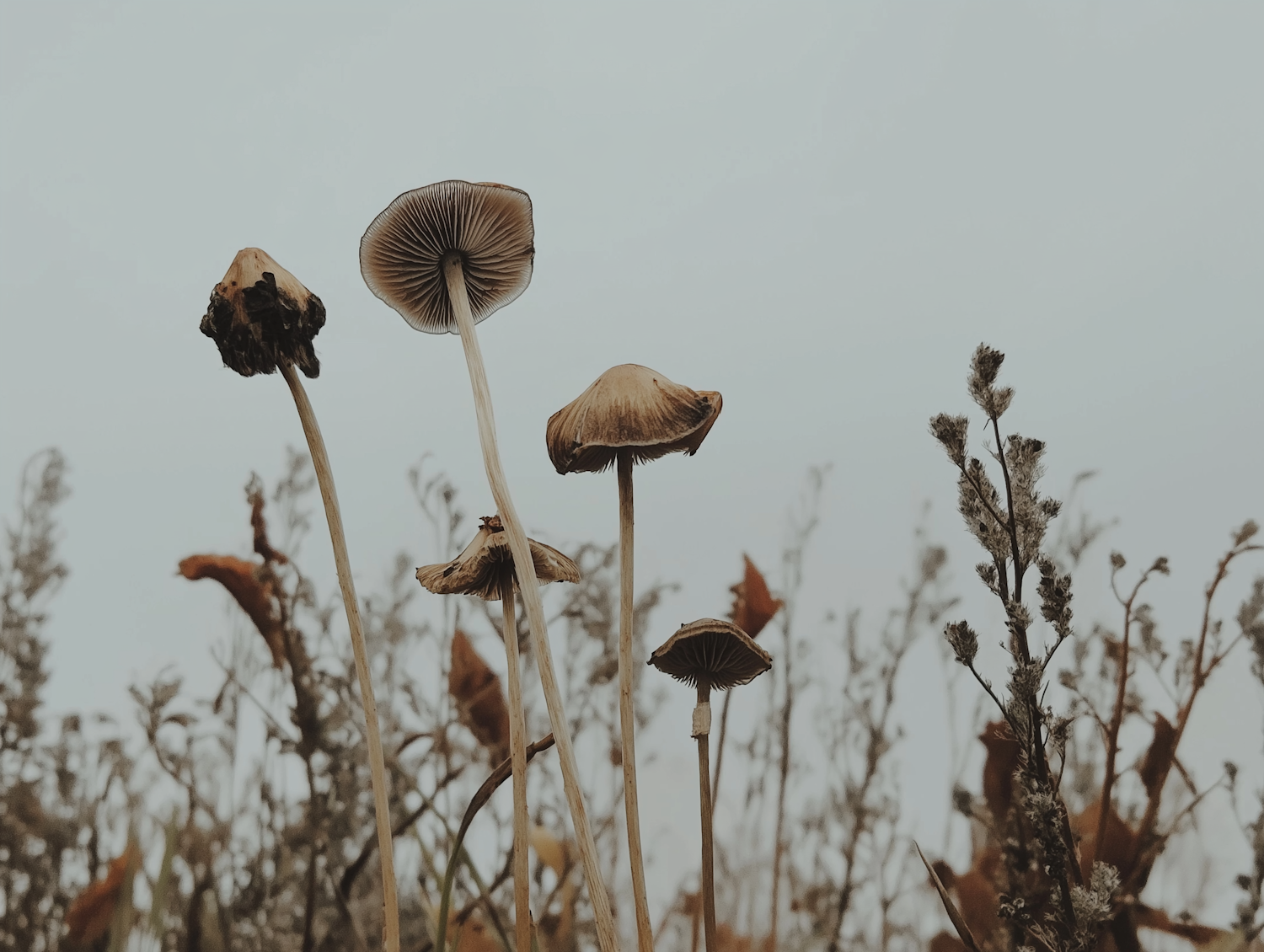 Tall, slender mushrooms with earthy tones stand amidst dry grasses under an overcast sky, creating a serene, natural scene.