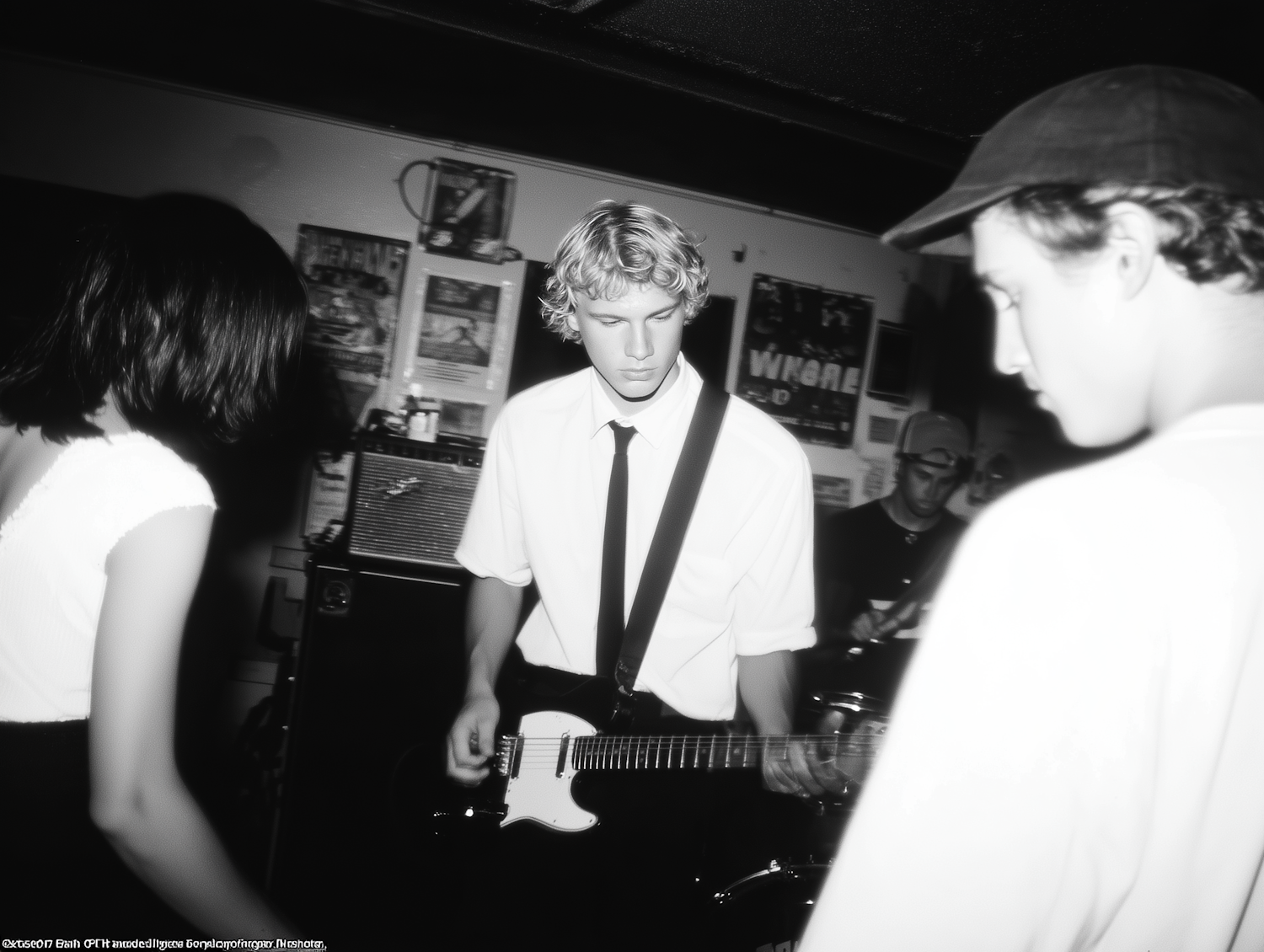 Black-and-white photo of a young band performing in an intimate venue, featuring a guitarist in a tie and casual onlookers.