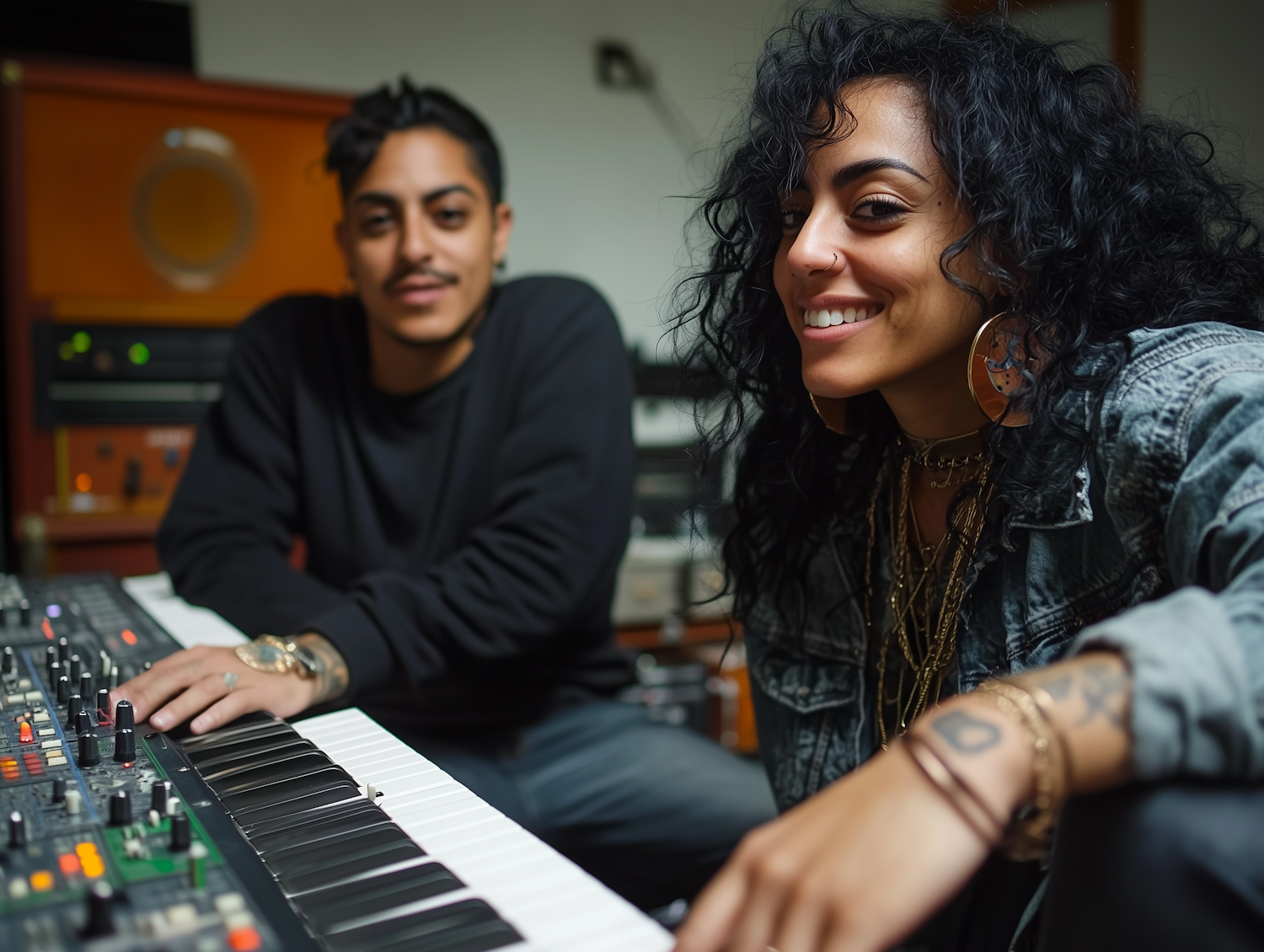 Two young musicians in a studio, smiling and relaxed, surrounded by audio equipment and a keyboard.