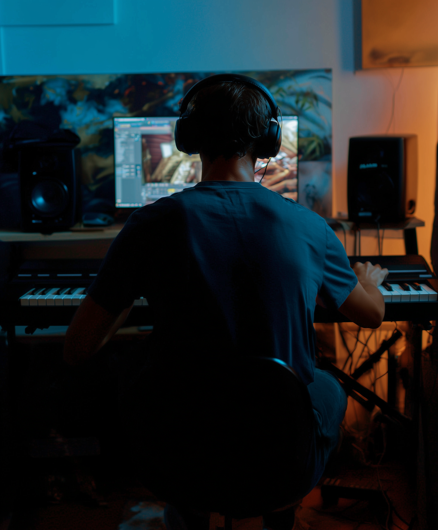 A person in a dimly lit room works on music production, playing a keyboard and using a computer, surrounded by studio equipment.