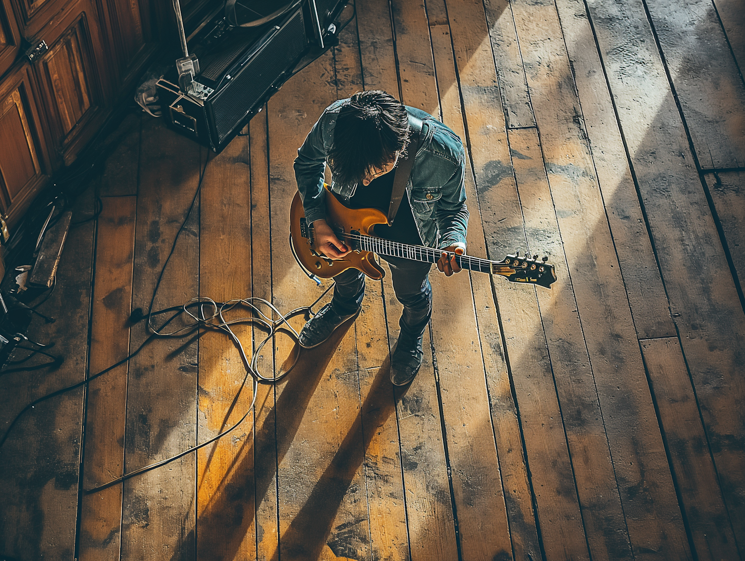 Musician playing electric guitar on a wooden floor, surrounded by cables and warm lighting, creating a dramatic atmosphere.
