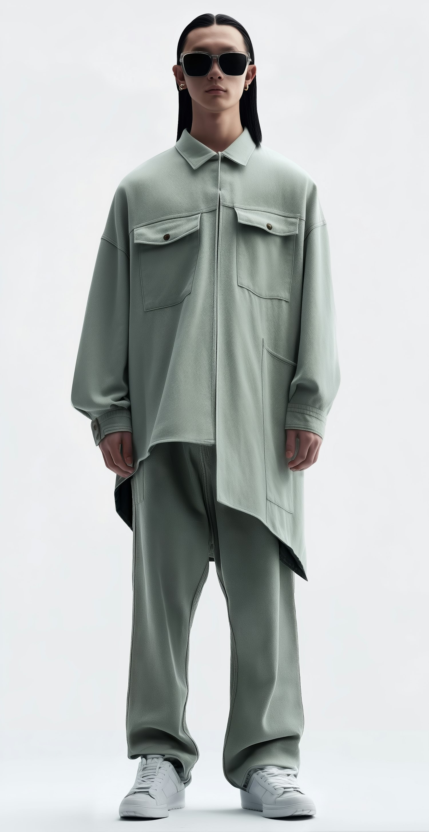 Stylish individual in a muted green outfit with oversized shirt and pants, accessorized with sunglasses and white sneakers.