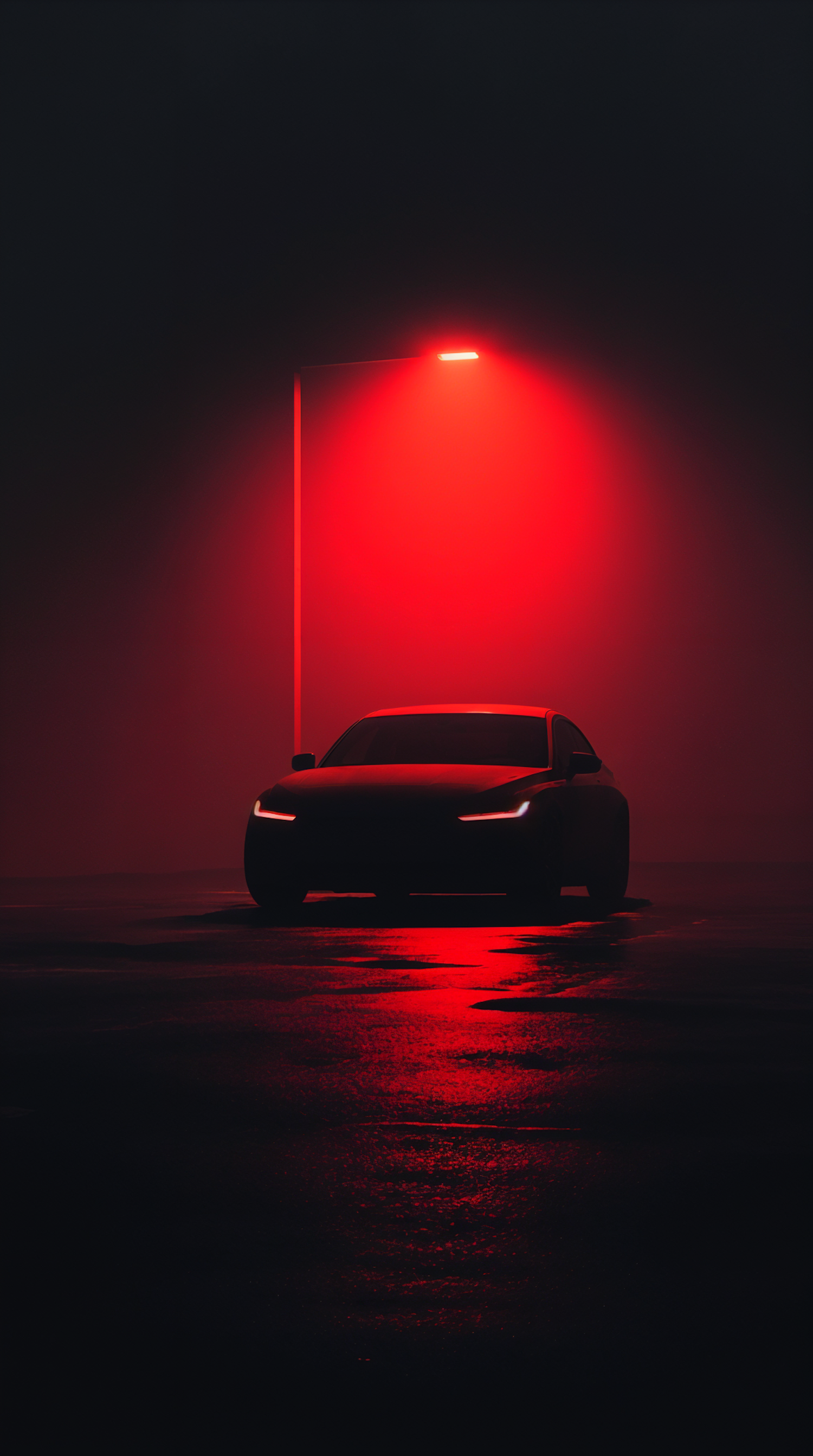 Sleek car under a red-lit streetlight, creating a dramatic and mysterious atmosphere with reflections on wet pavement.