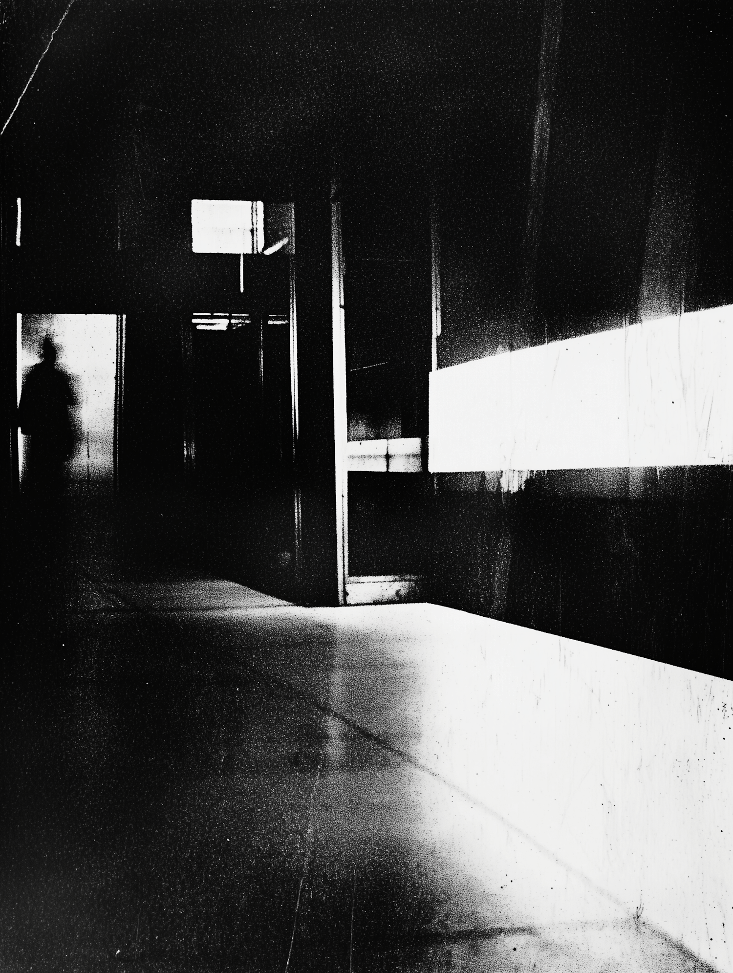 Eerie black and white corridor with a shadowy figure in the distance, creating a mysterious and suspenseful atmosphere.