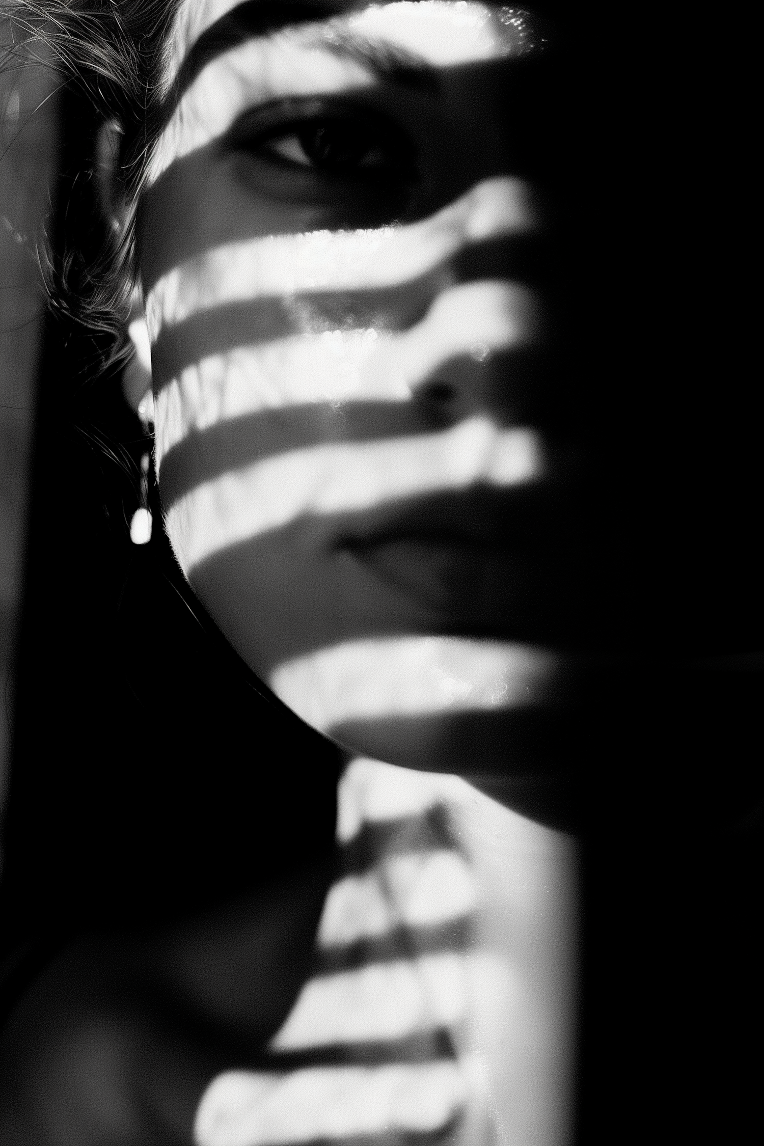 Black and white close-up of a face with dramatic shadows from blinds, highlighting one eye and lips, creating a mysterious atmosphere.
