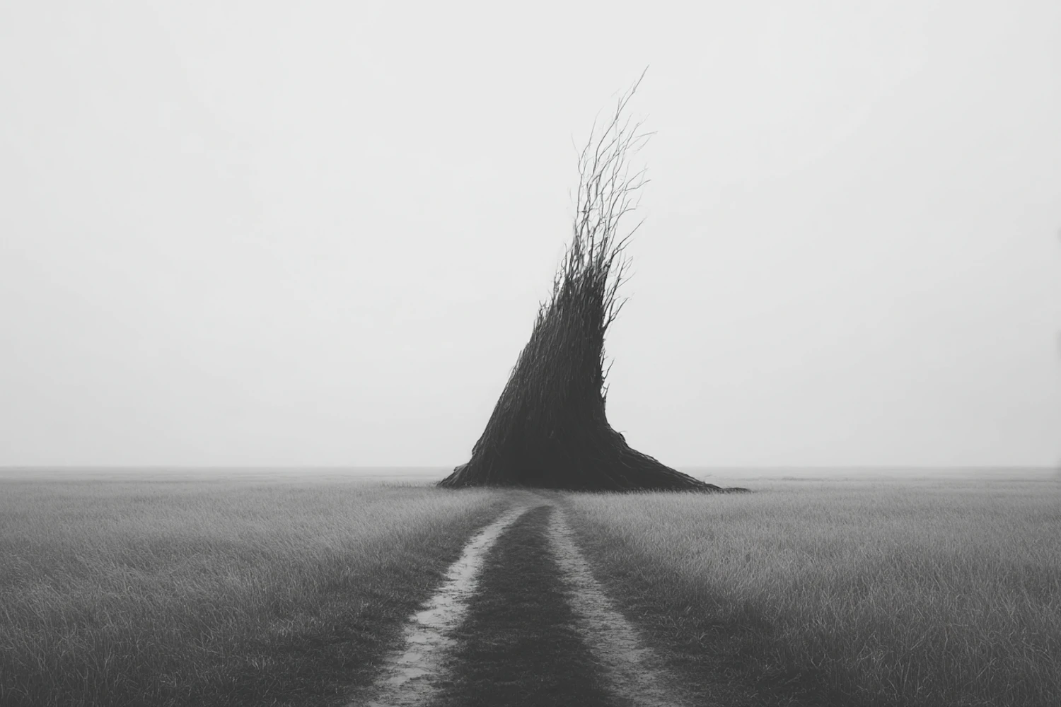 A black-and-white photo of a tall, branch-like structure in a grassy field with a dirt path leading to it under an overcast sky.