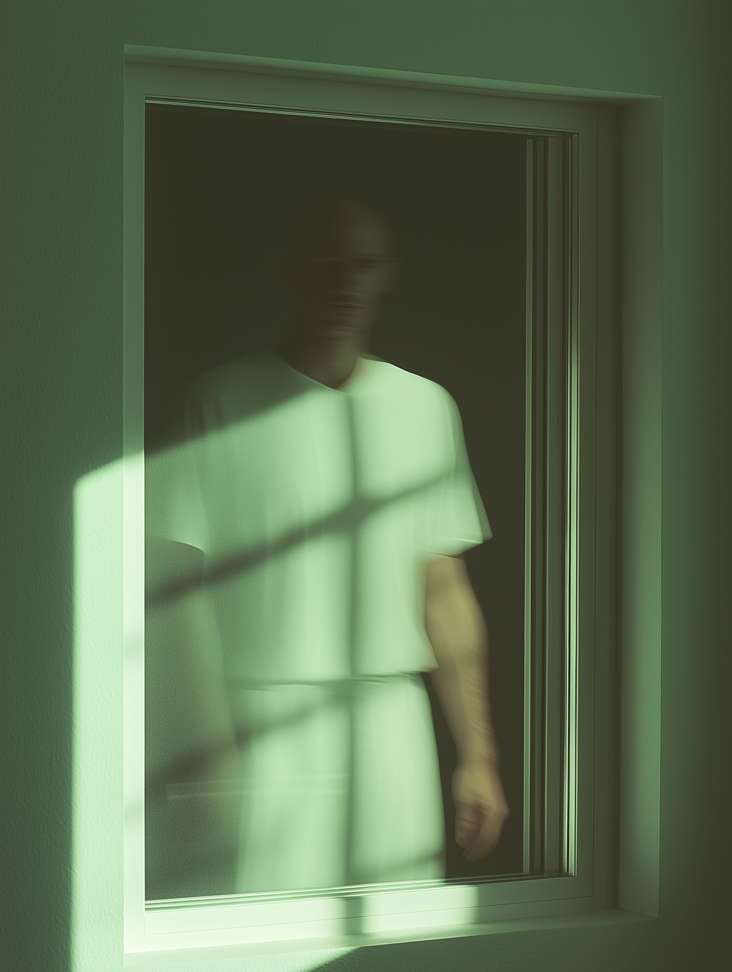 Blurred figure behind a green-tinted window, creating an eerie and mysterious atmosphere with shadows and a surreal quality.