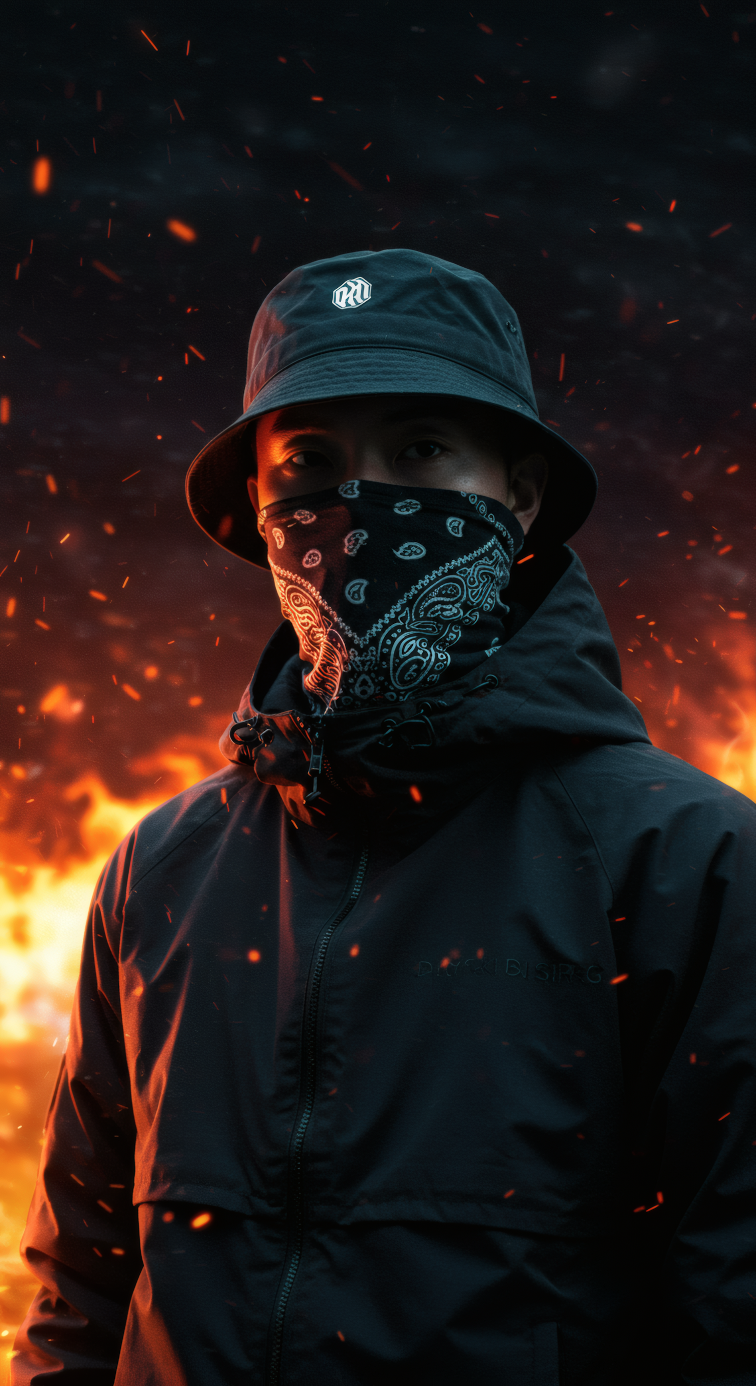 Mysterious figure in dark attire stands before a fiery backdrop, with sparks flying, creating an intense and dramatic scene.