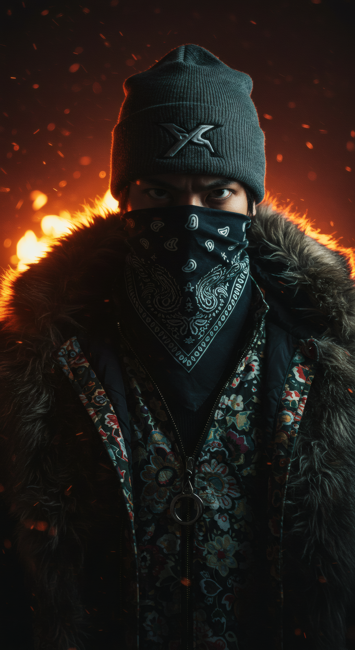 Mysterious figure in a beanie and bandana, set against a fiery backdrop with sparks. Intense eyes and floral coat add intrigue.