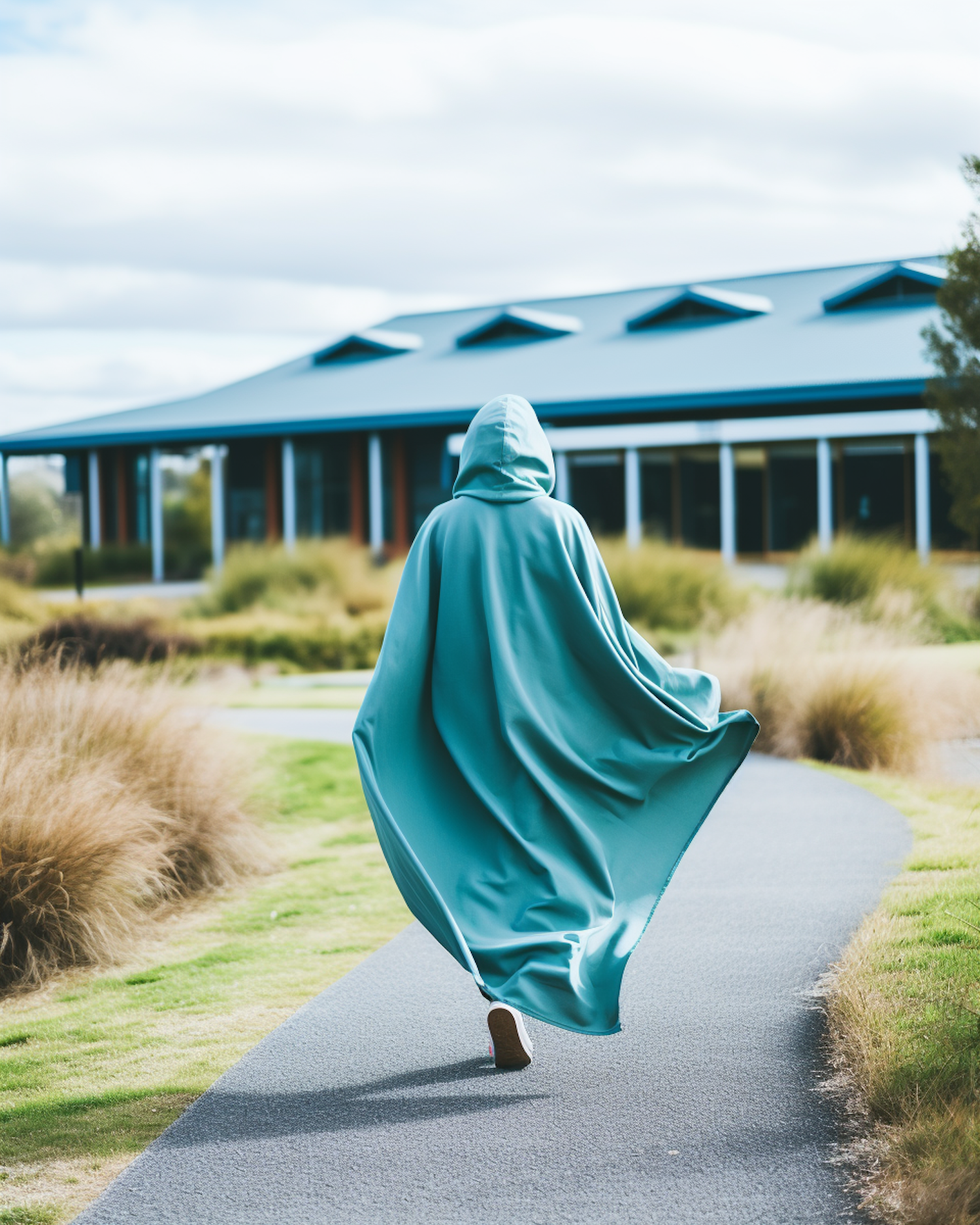 Person in a turquoise cloak walks on a path with a modern building in the background, surrounded by grass and an overcast sky.