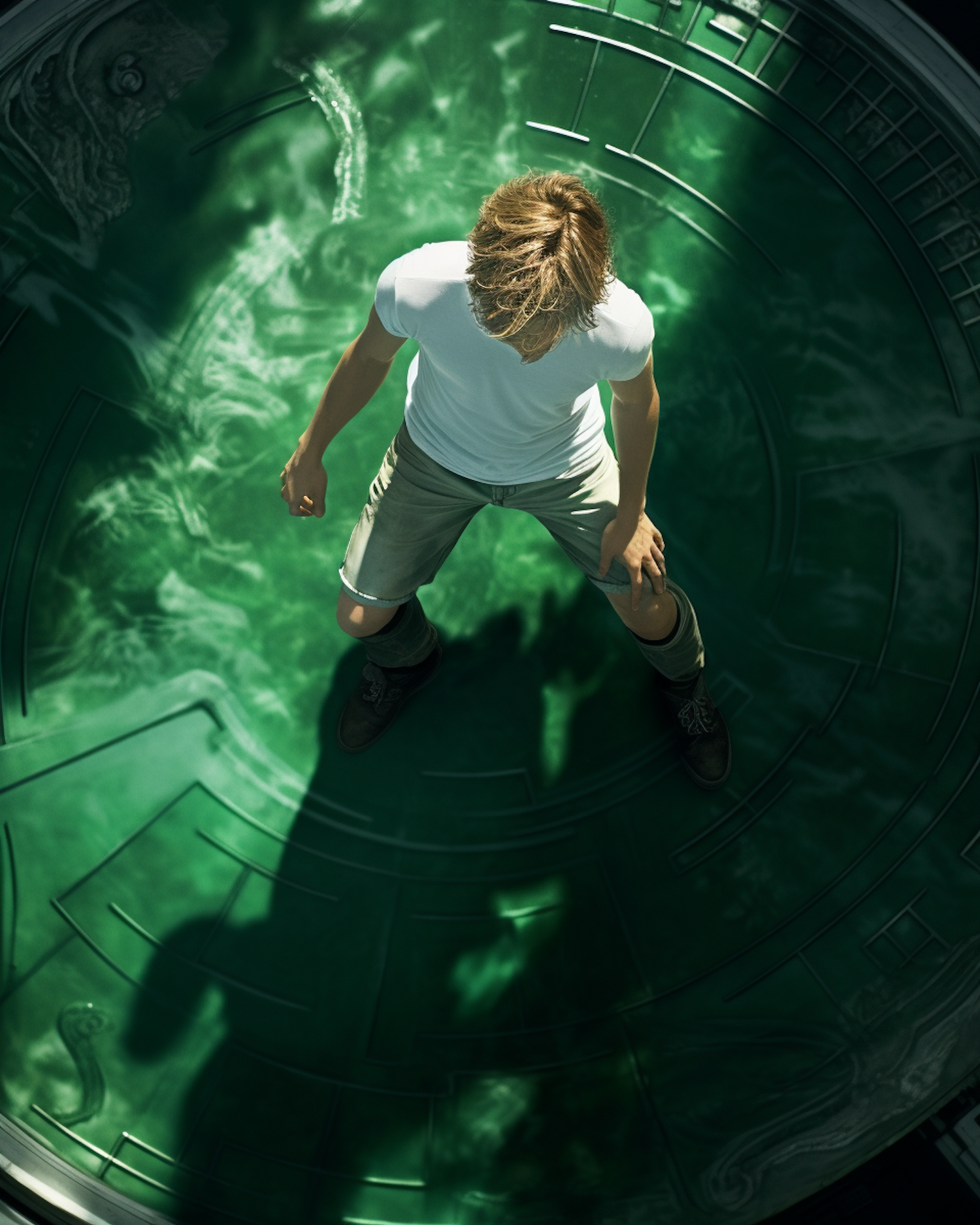 A young man stands on a green, intricately designed platform, casting a dramatic shadow. Viewed from above, the scene is mysterious and intriguing.