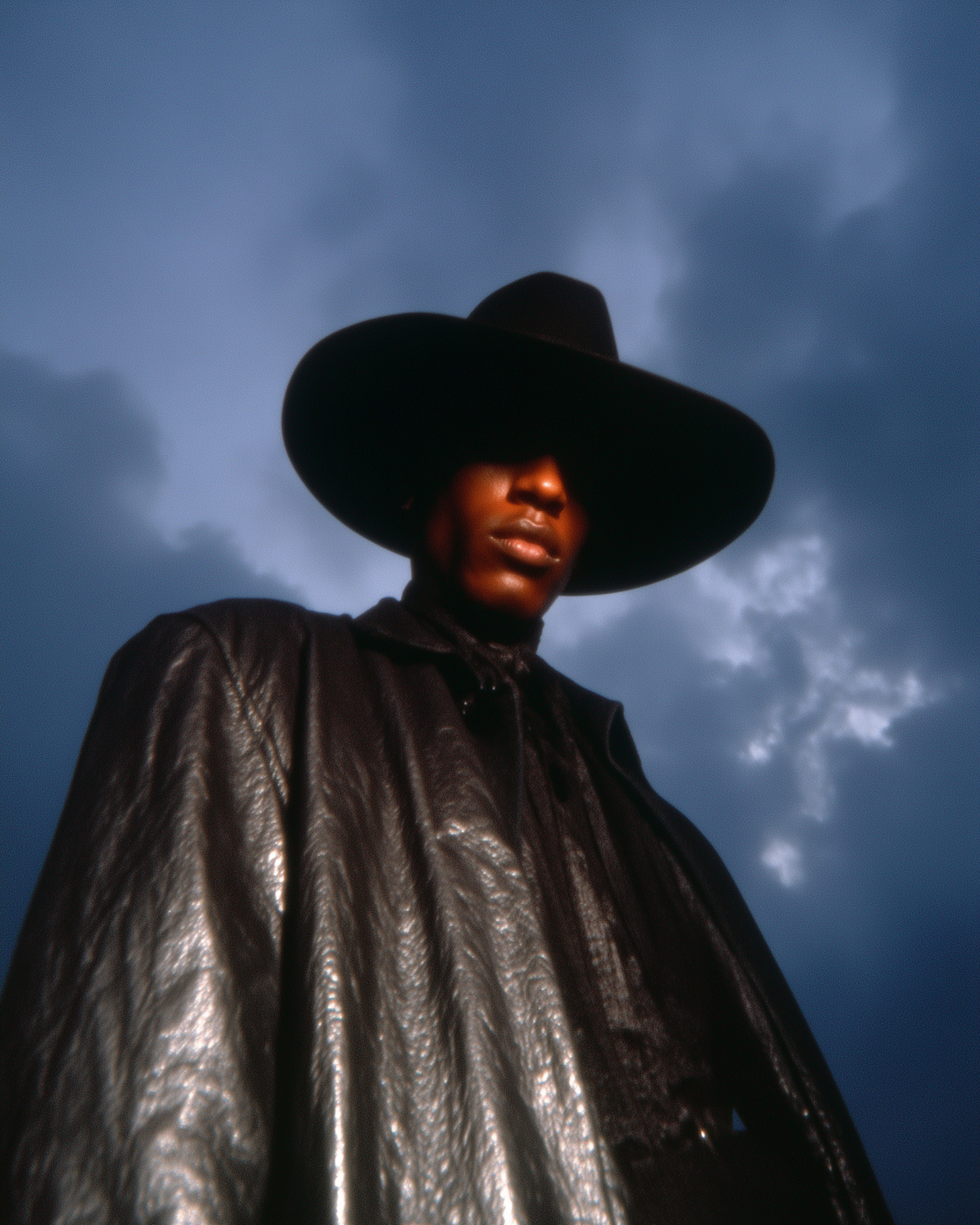 A person in a black hat and leather coat stands against a dramatic cloudy sky, creating a mysterious and stylish atmosphere.
