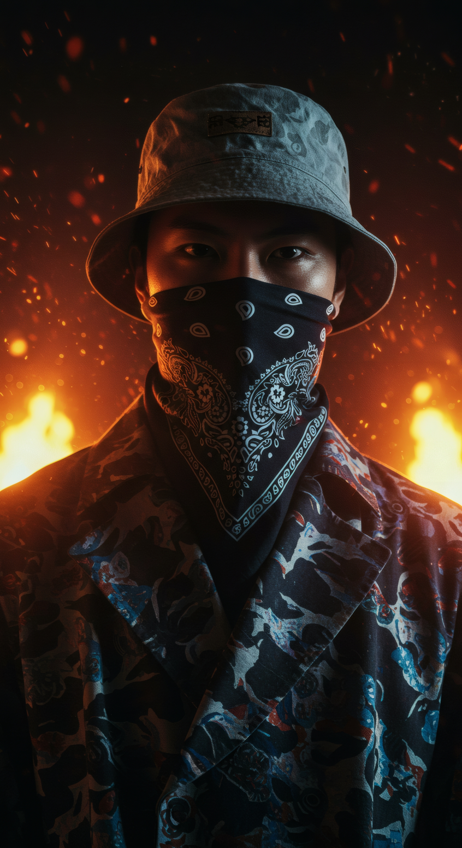 Mysterious figure in a bucket hat and bandana amidst glowing flames, exuding intensity and secrecy in a dramatic portrait.