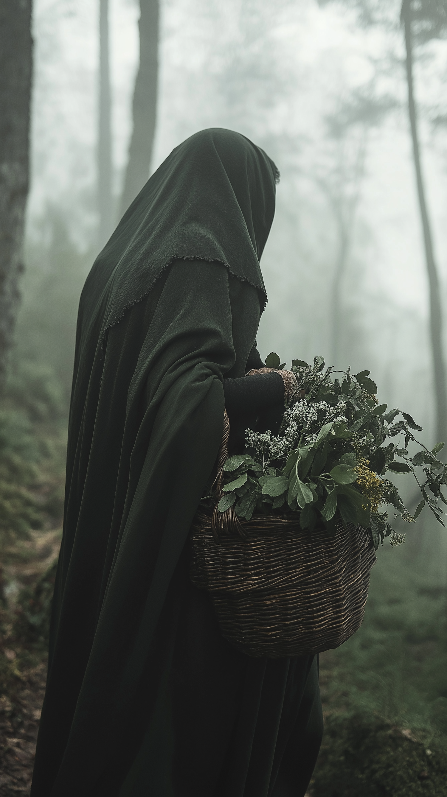 Mysterious cloaked figure in a misty forest carrying a basket of herbs and flowers, creating an ethereal and mystical atmosphere.