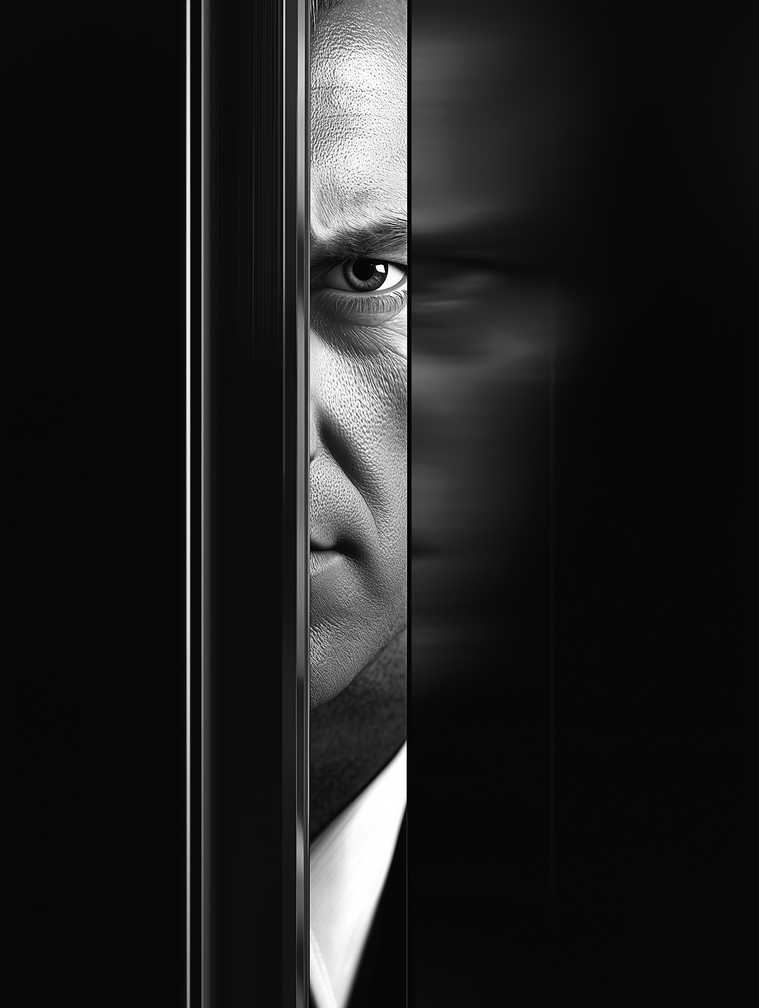 Black and white close-up of a man's intense eye peering through a narrow opening, creating a mysterious and dramatic atmosphere.