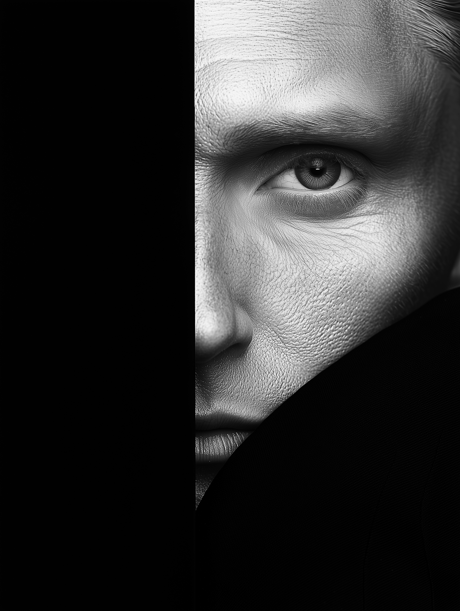 Dramatic black and white close-up of a face, highlighting eye and skin texture with striking contrast and shadow.