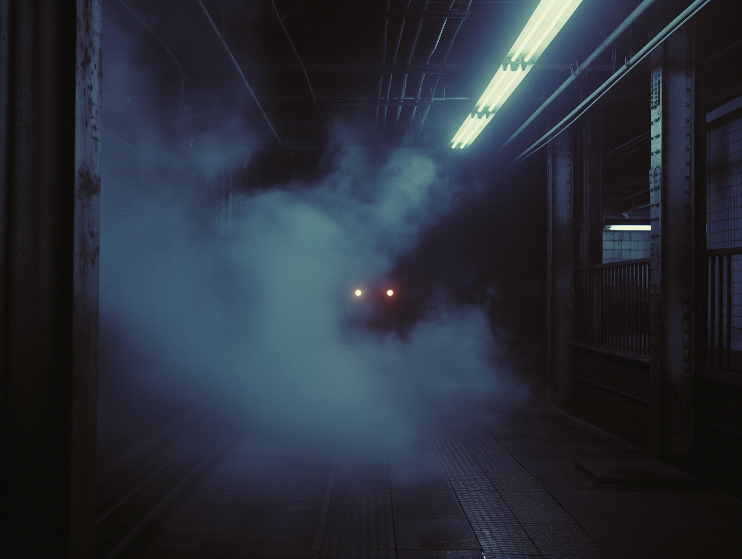Eerie subway platform shrouded in fog with distant train headlights. Dim lighting and cold tones create a mysterious atmosphere.