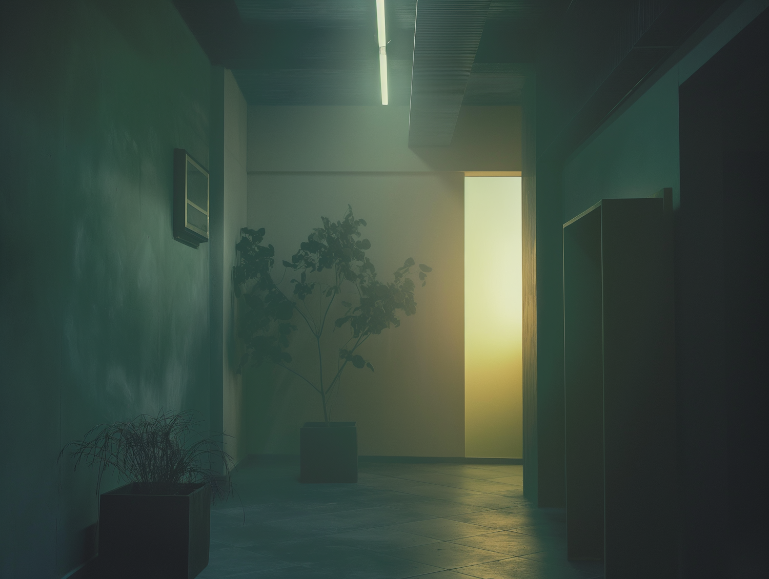Moody hallway with green walls, potted plants, and a warm light at the end, creating a mysterious and inviting atmosphere.